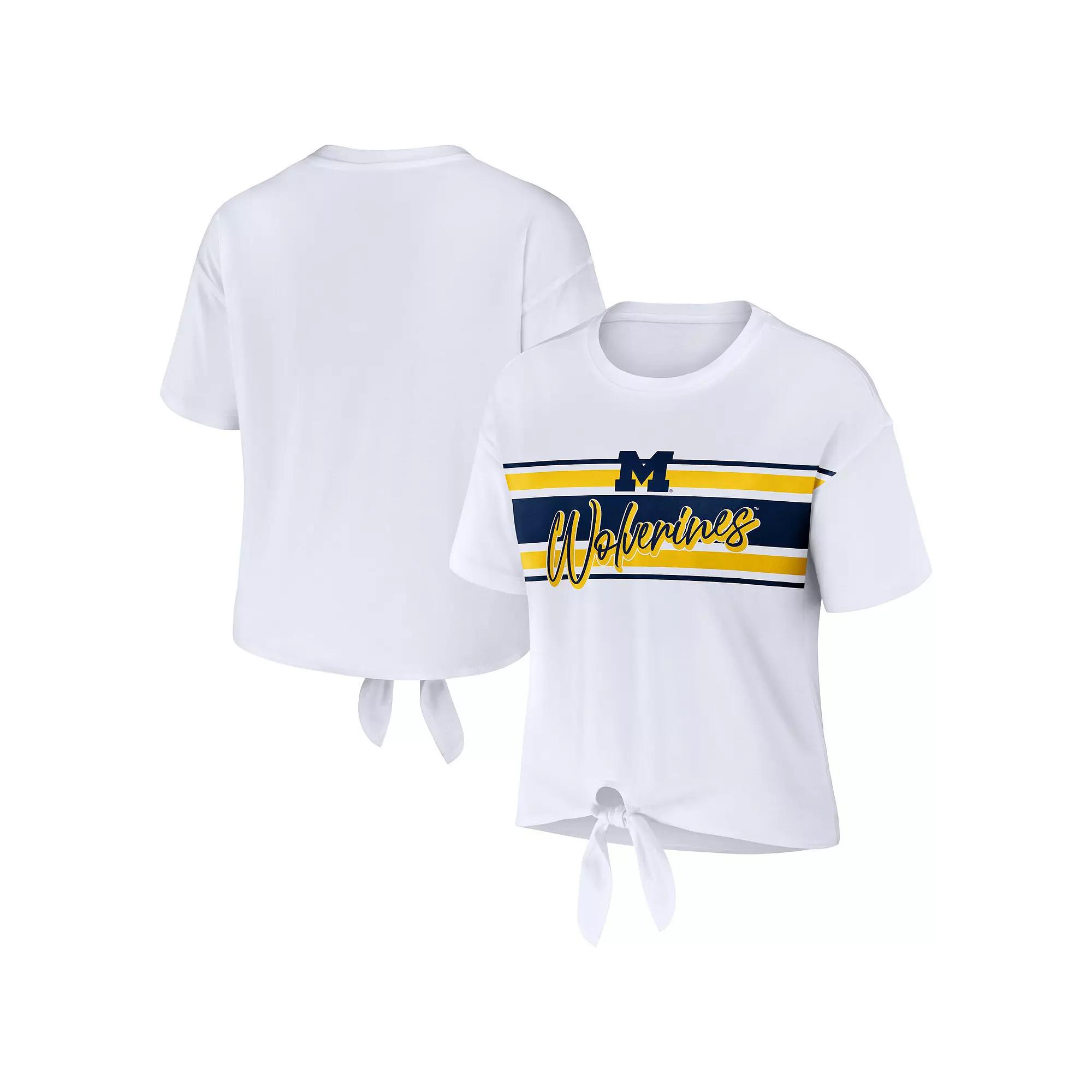 This Michigan Wolverines T-shirt from WEAR by Erin Andrews offers a fresh look for game day. It features charming Michigan Wolverines graphics complemented by coordinating stripes and a front tie knot. A cropped hem adds even more appeal.This Michigan Wolverines T-shirt from WEAR by Erin Andrews offers a fresh look for game day. It features charming Michigan Wolverines graphics complemented by coordinating stripes and a front tie knot. A cropped hem adds even more appeal.PRODUCT FEATURESCrew neckBrand: WEAR by Erin AndrewsSlightly dropped shouldersMaterial: 100% CottonFront tie knotImportedOfficially licensedScreen print graphicsShort sleeve Size: 2X. Color: White. Gender: female. Age Group: adult.