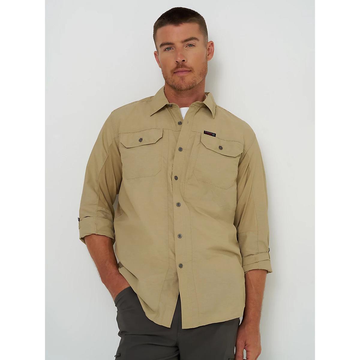 MIXED MATERIAL FOR OUTDOOR COMFORTATG by Wrangler™ is a collection of everyday outdoor styles that will keep you dry and comfortable in all conditions. This mix material shirt has it all: style, functionality, and protection. Its mixed material design incorporates contrasting, breathable knit panels at the sides and sleeves for optimum comfort and mobility. This shirt features a regular fit with convertible roll-up back capping on the sleeves, moisture-wicking properties, and UPF 30 protection for those sunny days. We also added a utility zip pocket and a glasses cleaner at the hem to ensure you are ready for wherever the day takes you.