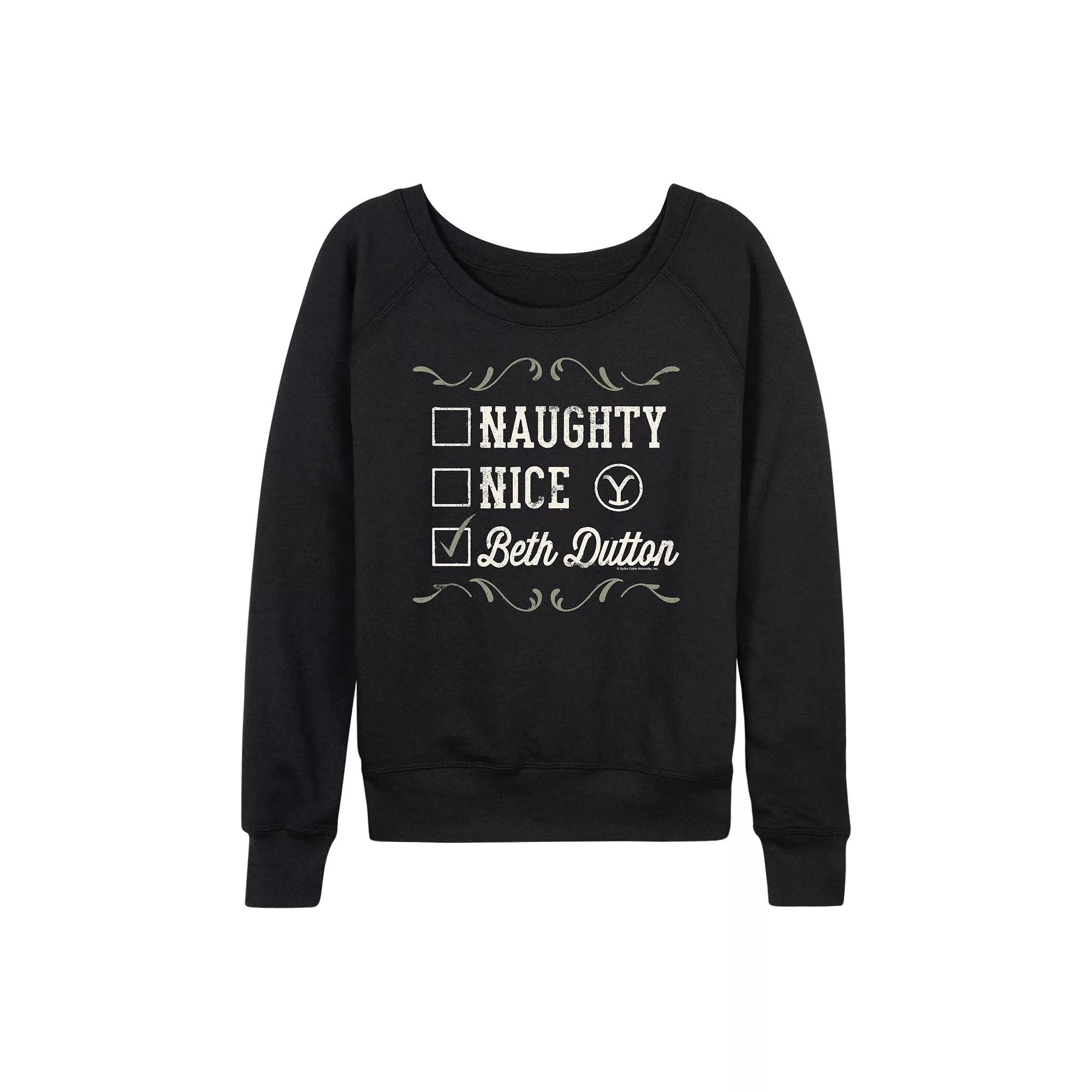She will love showing off her style with this Womens Yellowstone Naughty Nice Beth Dutton Lightweight French Terry Sweatshirt . FEATURES Long sleeves ScoopneckFABRIC & CARE Cotton/Polyester, French Terry Machine wash Imported Size: Small. Color: Black. Gender: female. Age Group: adult.