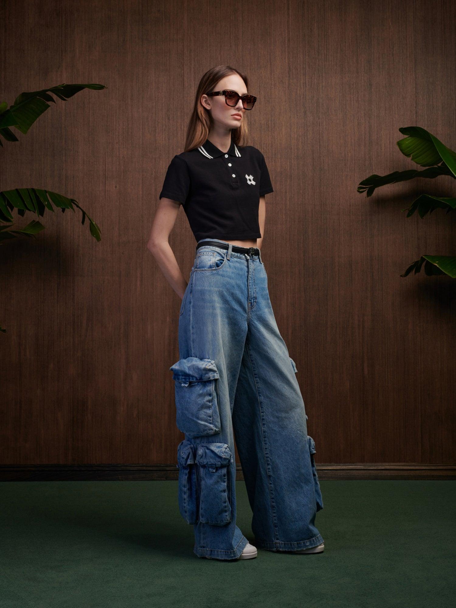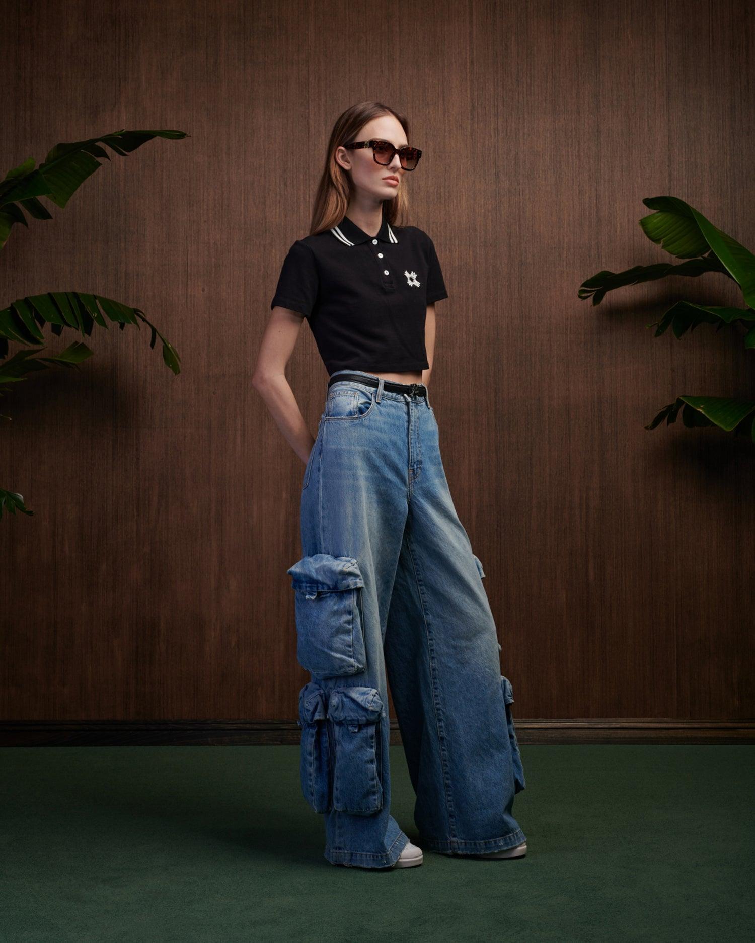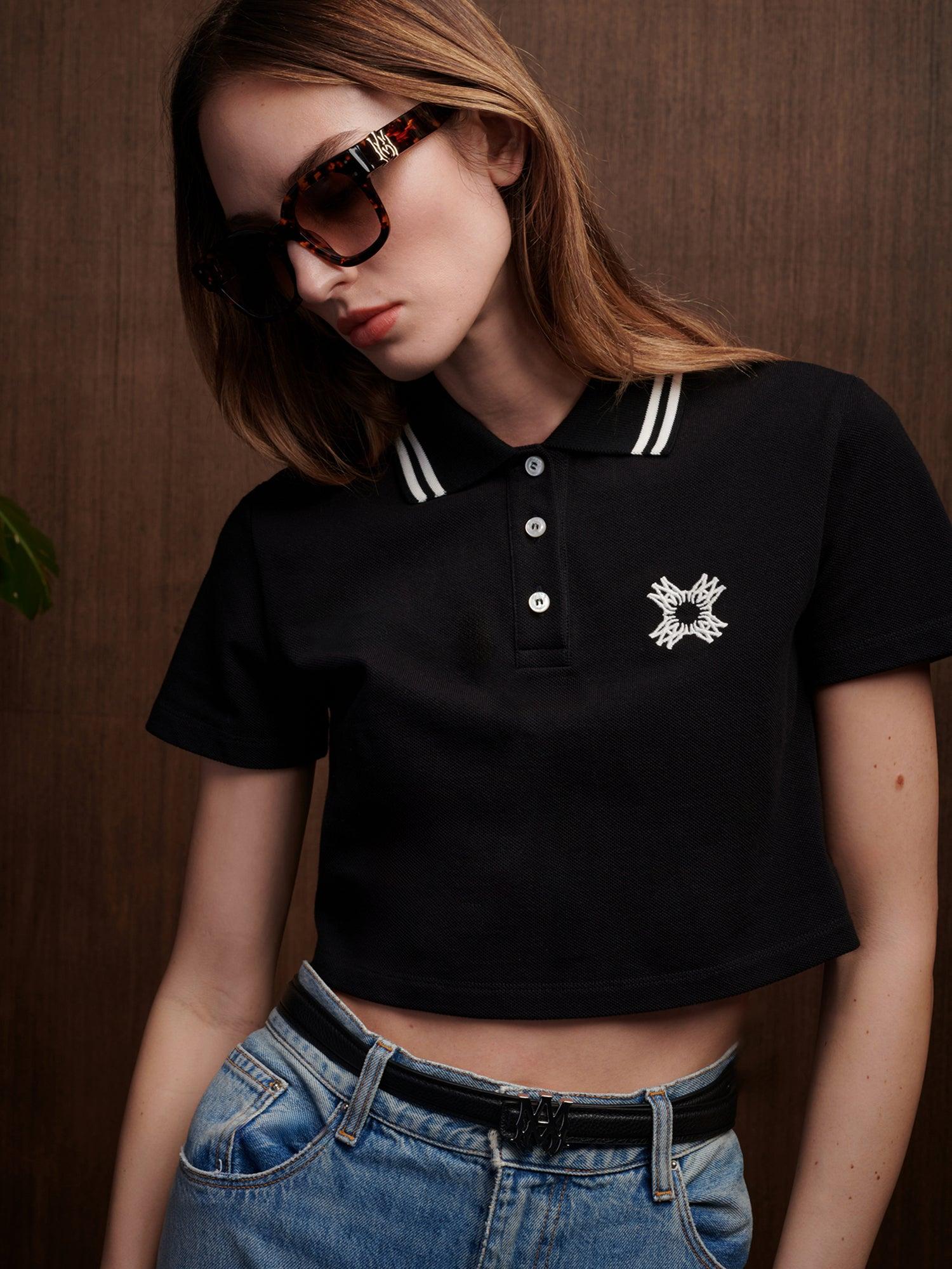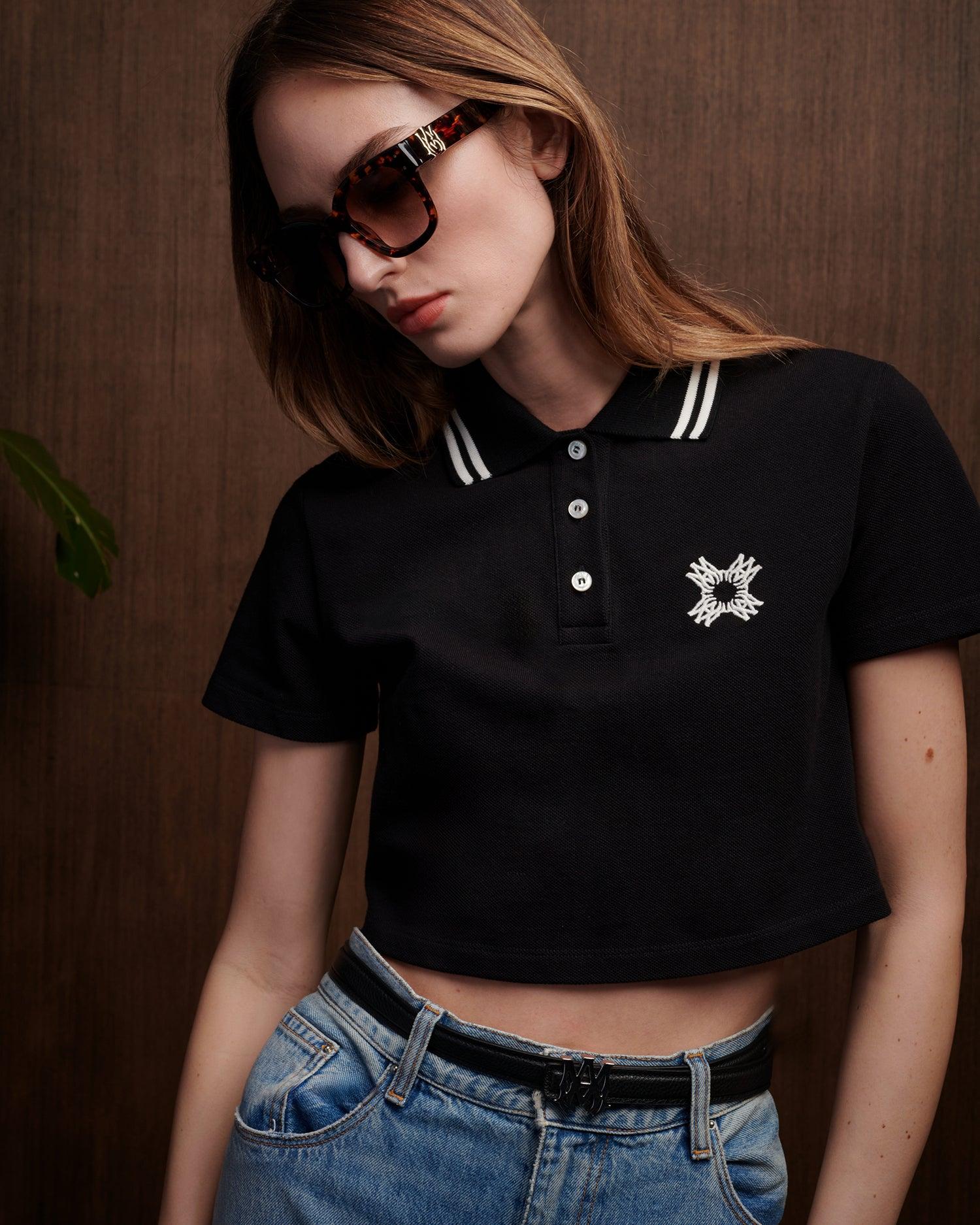 The visual cues of court athletics are adapted with house signature graphics for Pre-Spring 2025. The MA Quad Cropped Polo in cotton is designed with three-button closure and embroidered MA Quad graphic at chest. PRE-SPRING 2025 COLLECTION MADE IN ITALY 100% COTTON