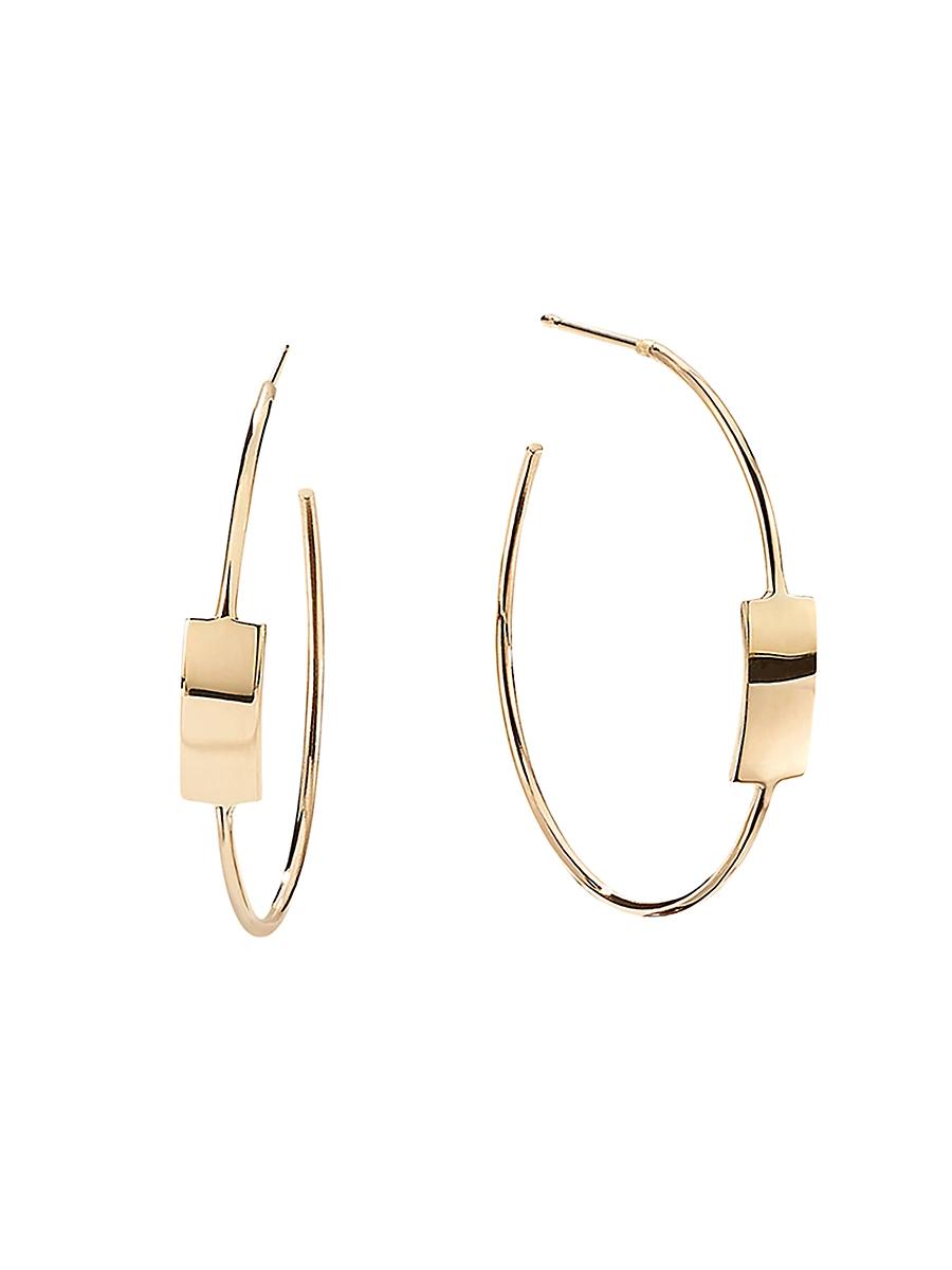 Crafted of 14K yellow gold, Lana Jewelrys hoop earrings are sculpted with rectangular tags at the face. This chic pair is from the labels Twenty Vol. 1 Collection, a line of modern yet timeless pieces released in celebration of the brands 20th anniversary. 14K yellow gold Post back Imported SIZE Diameter, about 1.06. Fashion Jewelry - Modern Jewelry Designers > Lana > Saks Fifth Avenue > Barneys. Lana.