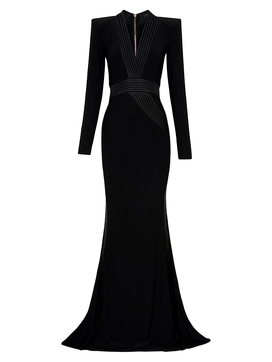 From the Battle Lines collection. Crafted of luxurious stretch jersey, The Heiress gown is designed with signature stitched satin paneling in a chic, floor-length silhouette. V-neck Long sleeves Back metallic zip closure Signature stitched satin waistband Side pockets 95% polyester/5% elastane Hand wash Imported SIZE & FIT About 64 from shoulder to hem Model measurements: 510 tall Model is wearing a US size 4 ABOUT THE BRAND ZHIVAGO, founded in 2012 in Australia, has built a reputation for delivering a fusion of tailored, avant-garde separates and high-octane eveningwear. The labels bold ready-to-wear designs are a celebrity favorite. Dress Collections - Contemporary Evening > Zhivago > Saks Fifth Avenue > Barneys. Zhivago. Color: Black. Size: 2.