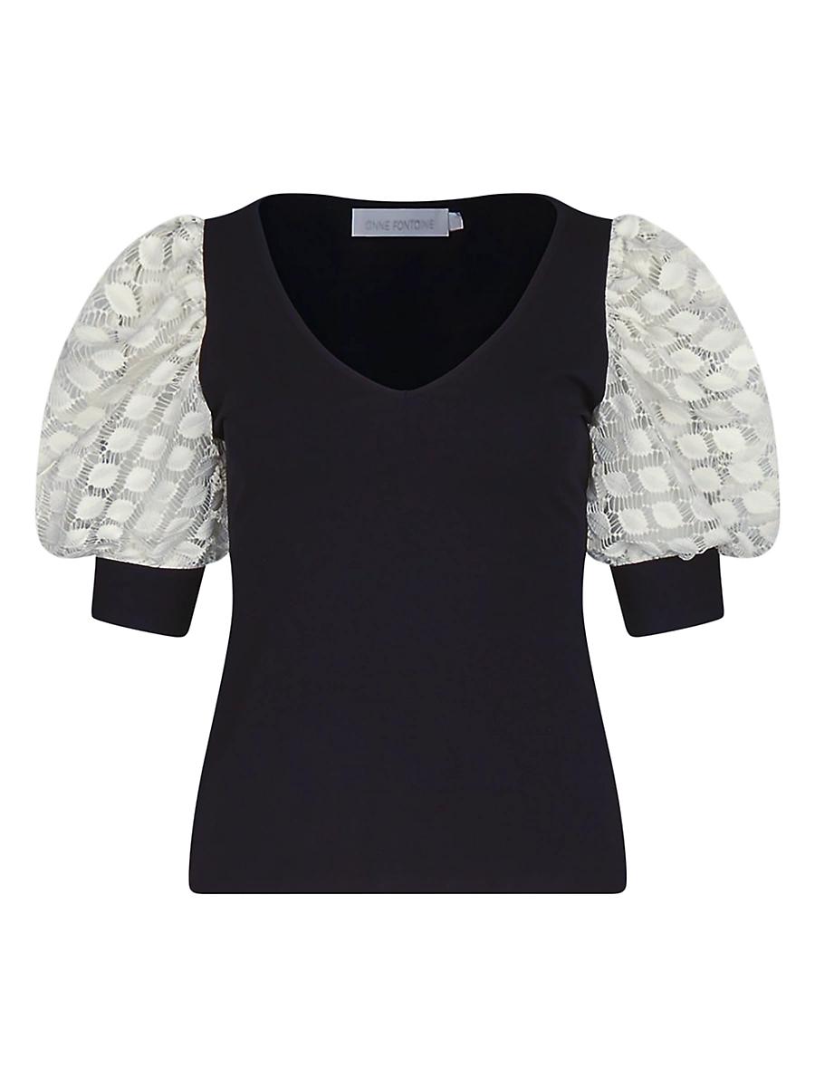 Made in France, Anne Fontaines Brook V-neck top is crafted of stretch-cotton jersey and styled with lace balloon short sleeves. V-neck Short sleeves, barrel cuffs Pulls over 92% cotton/8% elastane Trim: 100% polyester Dry clean Made in France SIZE & FIT Model measurements: 510 tall Model is wearing a US size 4. Modern Collections - Modern Coll > Anne Fontaine > Saks Fifth Avenue > Barneys. Anne Fontaine. Color: Moon White. Size: 4.