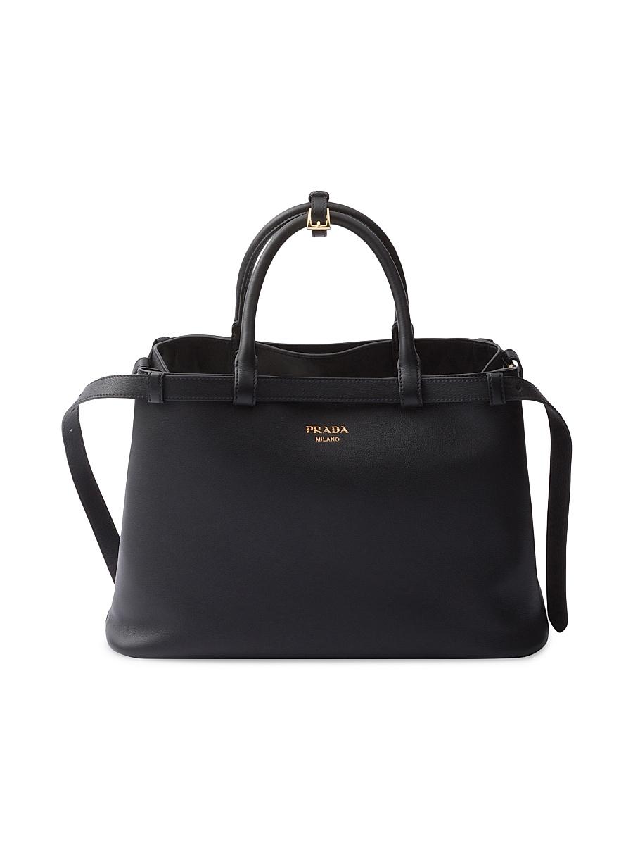 Clean lines and refined elements tell the story of Pradas dual aesthetic that blends simplicity and detail, functionality and elegance. This leather bag summarizes the brands stylistic codes in a pragmatic but sophisticated design, with nappa leather interior characterized by three compartments. The spacious silhouette is animated by the distinctive touch of the leather belts, both refined and modern. The hot-stamped lettering logo in 22K gold leaf adds a precious signature to the bag. Decorative straps with buckles Leather handles detachable Adjustable leather shoulder strap Maximum length 110 cm - Minimum length 100 cm - Maximum drop 55 cm - Minimum drop 50 cm Metal hardware Lettering logo printed on the front Nappa interior with center pocket Made in Italy SIZE 13.7 W x 9.8 H x 5.5 L. Lsd Handbags - Prada Handbags Access > Prada > Saks Fifth Avenue > Barneys. Prada. Color: Brown.