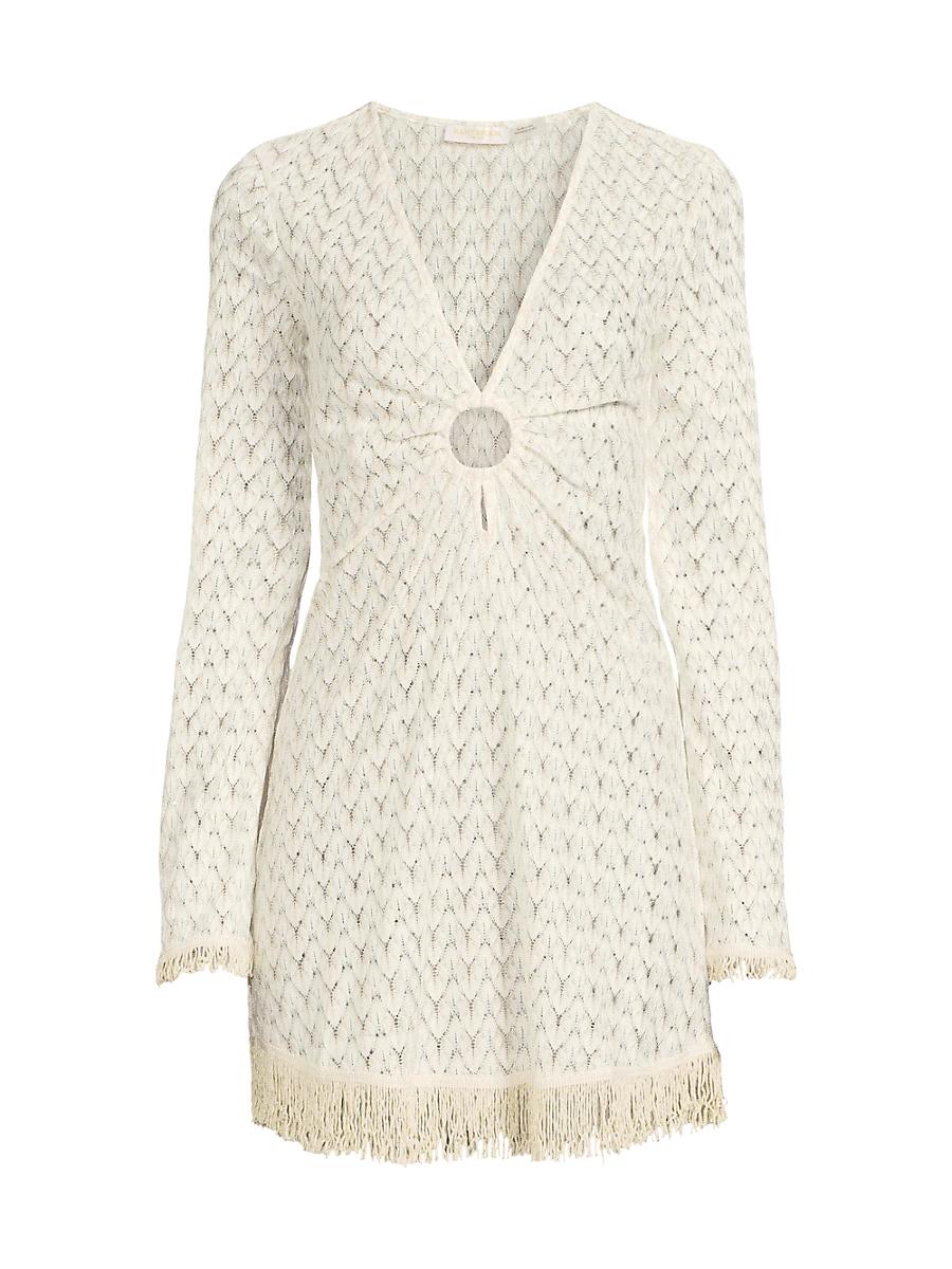 This Cassie minidress from Ramy Brook is designed with a zigzag chevron pattern and features metallic fringed trim. V-neck Long sleeves Fringed trim Pulls over 94% polyester/4% metallic fibers/2% nylon Hand wash Imported SIZE & FIT About 33 from shoulder to hem Model measurements: 510 tall Model is wearing a US size Small. Outerwear And Swimwear - Contemporary Swim > Ramy Brook > Saks Fifth Avenue > Barneys. Ramy Brook. Color: Whitegold Zig Zag. Size: XL.