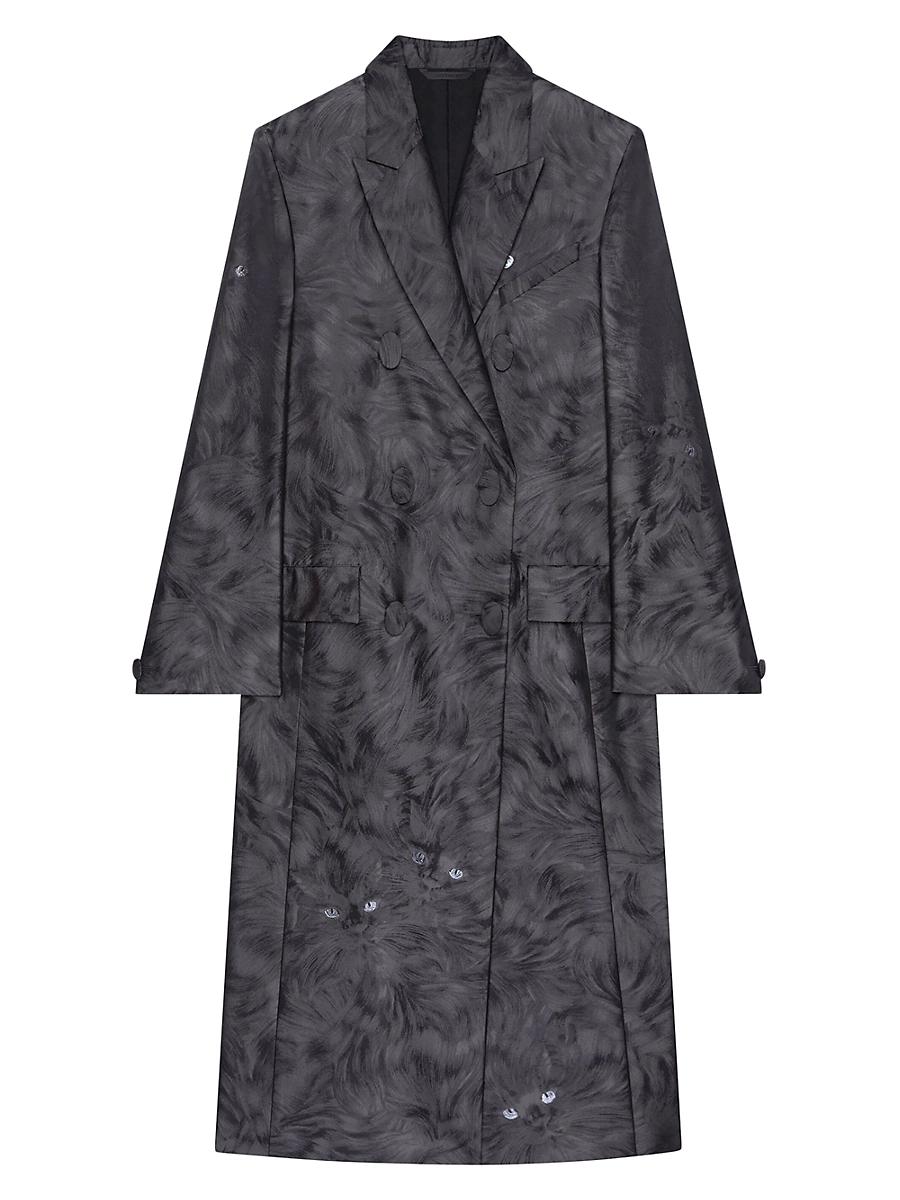 Coat in cat jacquard. Long coat in silk Pointed collar Cat jacquard Cat eyes in lurex thread Double breasted Covered oval buttons Buttoned cuffs One chest pocket Two front flap pockets Composition: 52% Polyester, 48% Silk Made in Italy. Lsd Rtw - Givenchy Rtw > Givenchy > Saks Fifth Avenue > Barneys. Givenchy. Color: Charcoal. Size: 4.