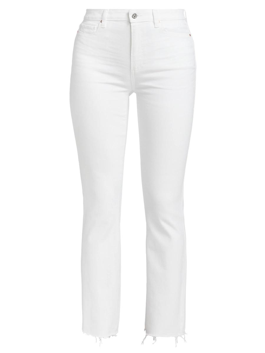 Cut in an ankle-crop silhouette, Paiges high-waisted Claudine jeans are finished with a flared leg and raw hem. Belt loops Banded waist Five-pocket style Raw hem Zip fly, button closure 98% cotton/2% elastane Machine wash Imported SIZE & FIT Rise, about 11.5 Inseam, about 28 Model measurements: 510 tall Model is wearing a US size 4. Contemporary Sportswear - Denim And Bottoms > Paige > Saks Fifth Avenue > Barneys. Paige. Color: Crisp White. Size: 25.