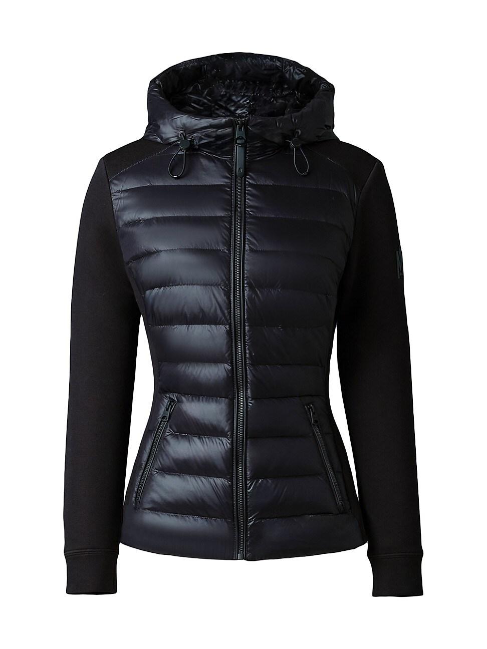 Mackage Della-R mixed-media jacket features puffer panelingand double-face jersey Approx. 24L from shoulder to hem Hoodwith adjustable drawcord storm visor Center front zip closure Long sleeves; banded cuffs M logo appliqu at left sleeve Side zip pockets Semi-fitted Cotton/polyester Lining: Recycled nylon GRS-certified recycled light down fill Machine wash Imported