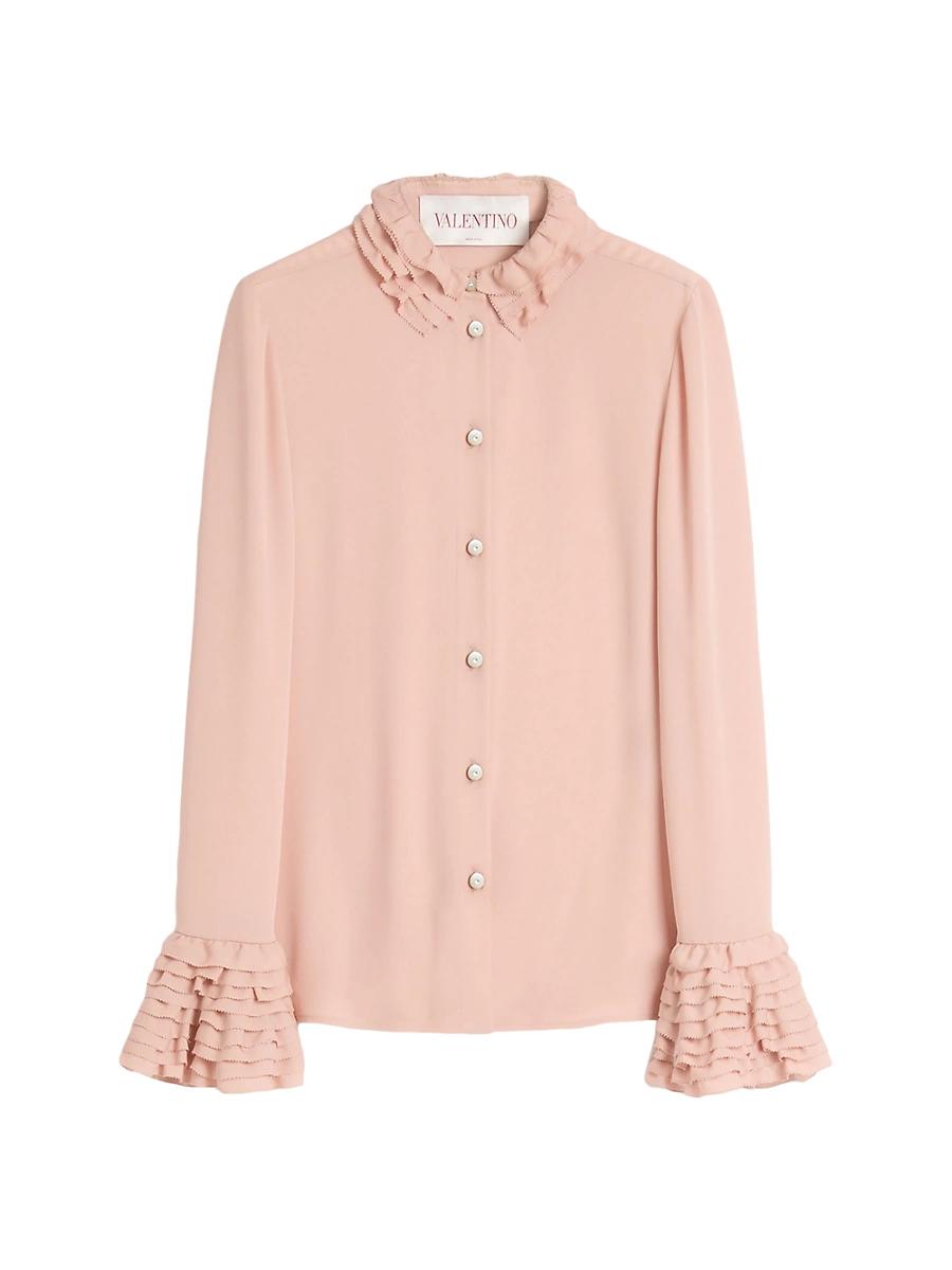 Georgette shirt. Ruffle detail at cuffs and neck Front button closure Georgette (100% Silk) Unlined Length: 66 cm / 27.5 in. from the shoulders in an Italian size 40 Sleeve length: 83 cm / 32.6 in. from the center back in an Italian size 40 The model is 176 cm / 59 tall and wears an Italian size 40 Made in Italy. Lsd Rtw - Valentino Rtw > Valentino Garavani > Saks Fifth Avenue > Barneys. Valentino Garavani. Color: Rose Mist. Size: 0.