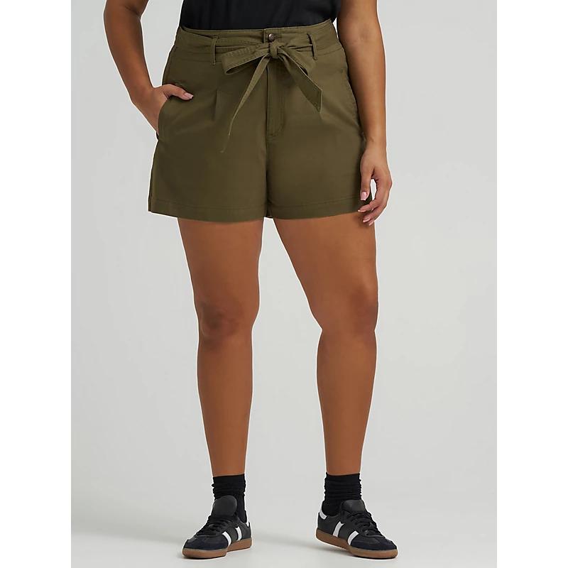 The best things come wrapped in a bow. These shorts start with a high-rise waist that falls into a 3.5” inseam, for a vintage look with a modern feel. Outfitted with front pleats and cinched with an oversized bow at the front, it’s the kind of short that keeps on giving. 89% Cotton, 11% Elastomultiester. Olive Moss. 22 W / 3 1 / 2 Inches.