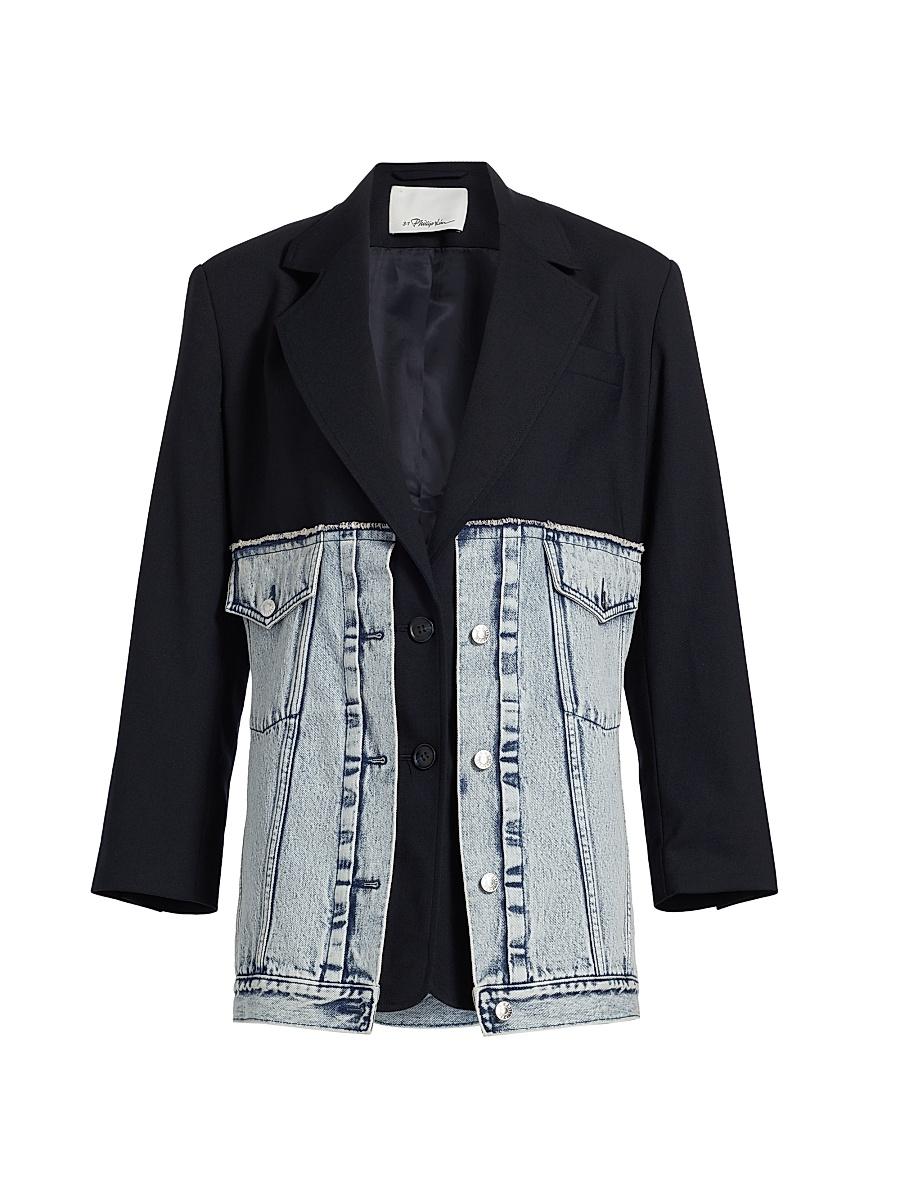 This 3.1 Phillip Lim oversized blazer features a denim mixed media design with back ties. The silhouette features notch lapels, button-through flap patch pockets, and a button-front closure. Notch lapels Long sleeves Chest button-through flap patch pockets Back ties Button-front closure 100% cotton Dry clean Imported SIZE & FIT About 30.25 from shoulder to hem Model measurements: 510 tall Model is wearing a US size Small. Contemporary Sportswear - Workshop > 3.1 Phillip Lim > Saks Fifth Avenue > Barneys. 3.1 Phillip Lim. Color: Malibu Blue. Size: Medium.
