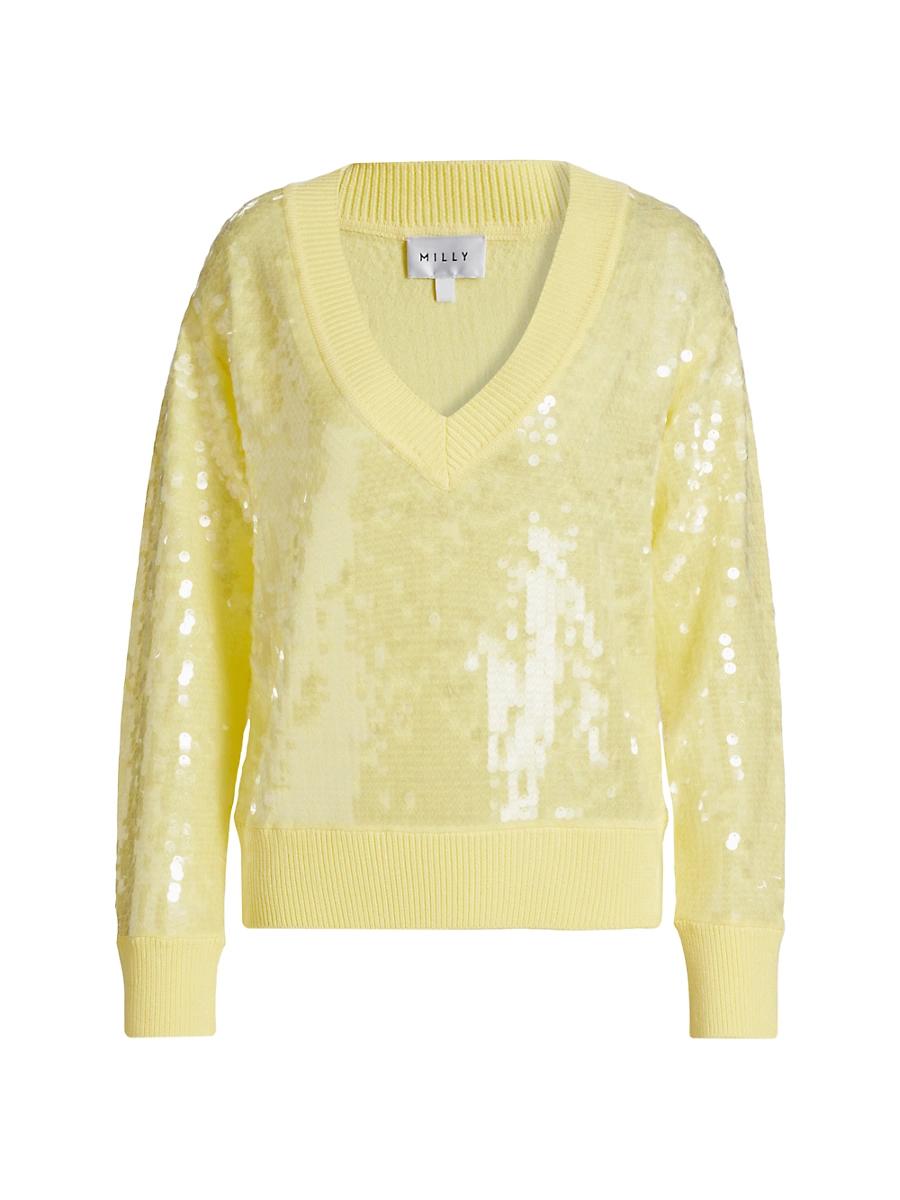 Millys Ilaria V-neck sweater combines comfort and glamour with its luxurious sequin detailing and rib-knit trim. V-neck Long sleeves Rib-knit trim Pulls over 60% cotton/40% viscose Trim: 100% polyester Dry clean Imported SIZE & FIT Model measurements: 510 tall Model is wearing a US size Small. Modern Collections - Milly > Milly > Saks Fifth Avenue > Barneys. Milly. Color: Light Yellow. Size: Medium.