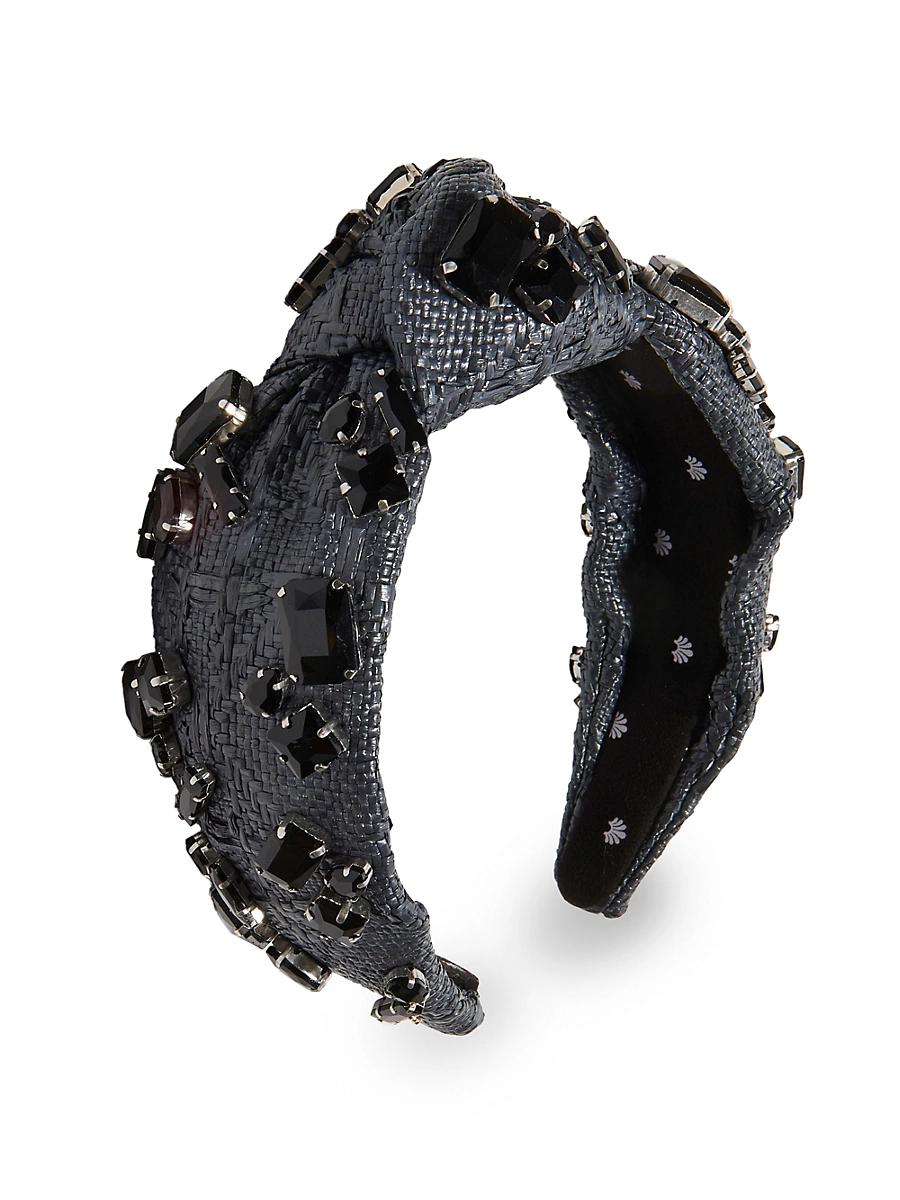 Crafted of raffia, the Knotted Candy Crystal headband from Lele Sadoughi is designed with a knot at the top and embellished with mixed cuts of glass crystals. Glass crystals Raffia Imported SIZE About 1.75W. Fashion Jewelry - Trend Jewelry > Lele Sadoughi > Saks Fifth Avenue > Barneys. Lele Sadoughi. Color: Jet.