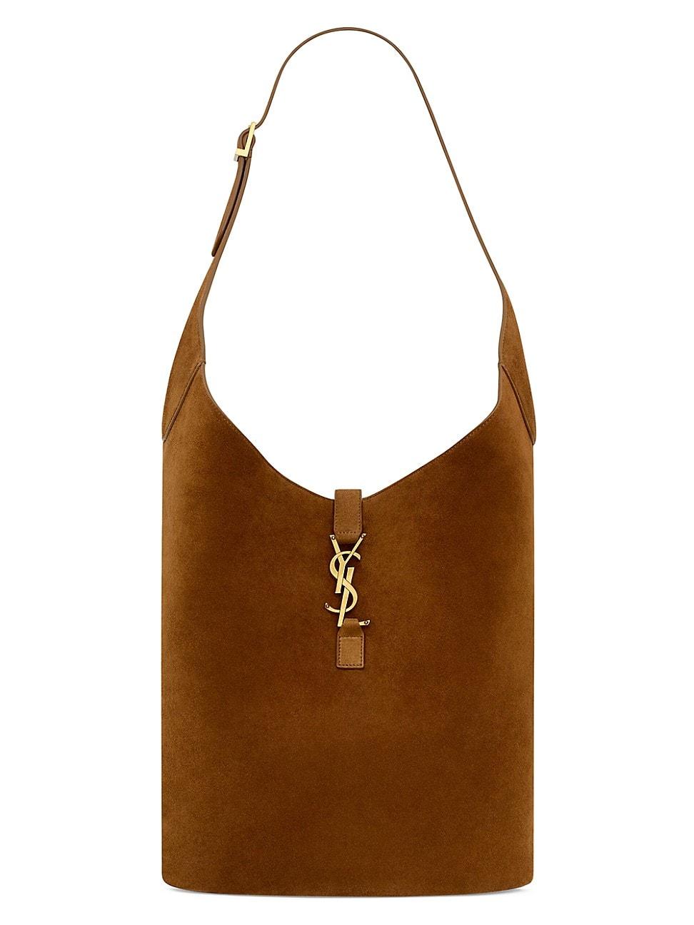 The hobo bucket bag version of the iconic Le 5 7 in suede, defined by its leather tab closure decorated with the Cassandre. Spacious and lined in tonal leather, it features one main compartment with an inner zip pocket. An adjustable strap allows for bespoke carry options. Leather lining Bronze-toned hardware Four metal feet Dimensions: 26-44 X 32 X 3 cm / 10.2-17.3 x 12.6 x 1.2 Handle drop: 33 cm / 13 90% calfskin, 10% brass Made in Italy. Lsd Handbags - Saint Laurent > Saint Laurent > Saks Fifth Avenue > Barneys. Saint Laurent. Color: Caramel Cognac.