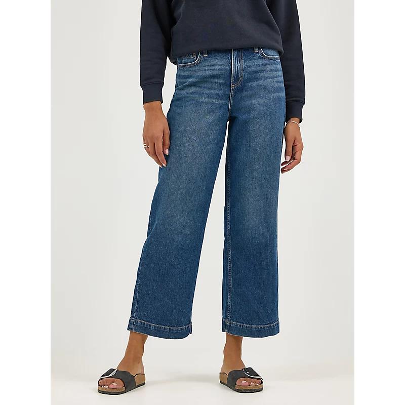 Whether you’re walking along the crashing waves or visiting an open-air market, the capri is the ultimate warm weather pant. Embrace the sunshine with the Lee® legendary wide leg crop. These jeans start with a high waist that hugs your curve, loosening throughout the leg for a comfortable wide leg feel. They come adorned with all of the classic Lee hardware, including spade pockets, a brass logo button, and five pockets to hold all of your essentials. Plus, they’re made from a recycled cotton blend for a cute look that also feels good for the planet. 99% Cotton, 1% Elastane. Eat It Up. 8 W / 26 Inches (M).