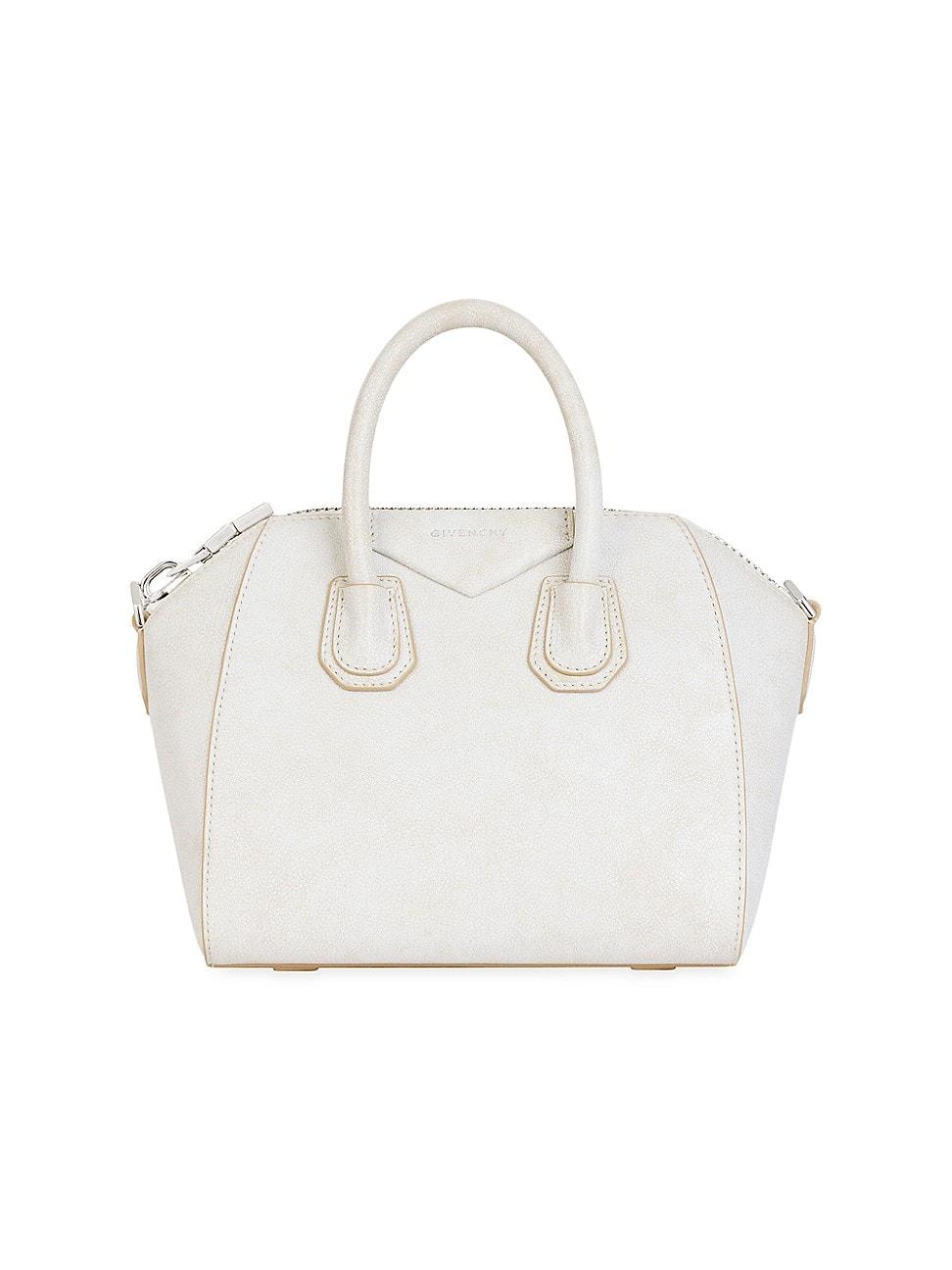 Mini Antigona bag in aged leather. Mini handbag or crossbody bag in tumbled calfskin leather aged by hand Antigona line Zipper closure with Givenchy 4G zipper pull Pentagonal patch with silvery debossed Givenchy signature Adjustable and removable leather shoulder strap Silvery-finish metal details One zippered pocket inside Shoulder strap length: 19 in. Handle: 3 in 100% calfskin leather Lining: 90% cotton, 10% polyester. Metal parts: 100% brass Dimensions: 10.2 in x 7.5 in x 5.1 in Made in: Italy. Lsd Handbags - Givenchy > Givenchy > Saks Fifth Avenue > Barneys. Givenchy. Color: Ivory.