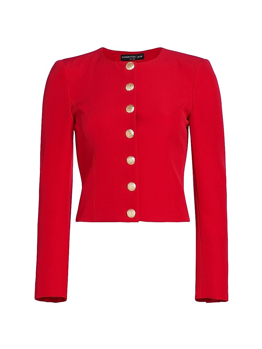 The Olempia blazer from Generation Love features a round neck, long sleeves, and a button-front closure.Round neckLong sleeves, button cuffsButton-front closure95% polyester/5% elastaneLining: 95% polyester/5% elastaneDry cleanImportedSIZE & FITAbout 19” from shoulder to hemModel measurements: 5'10” tallModel is wearing a US size Small