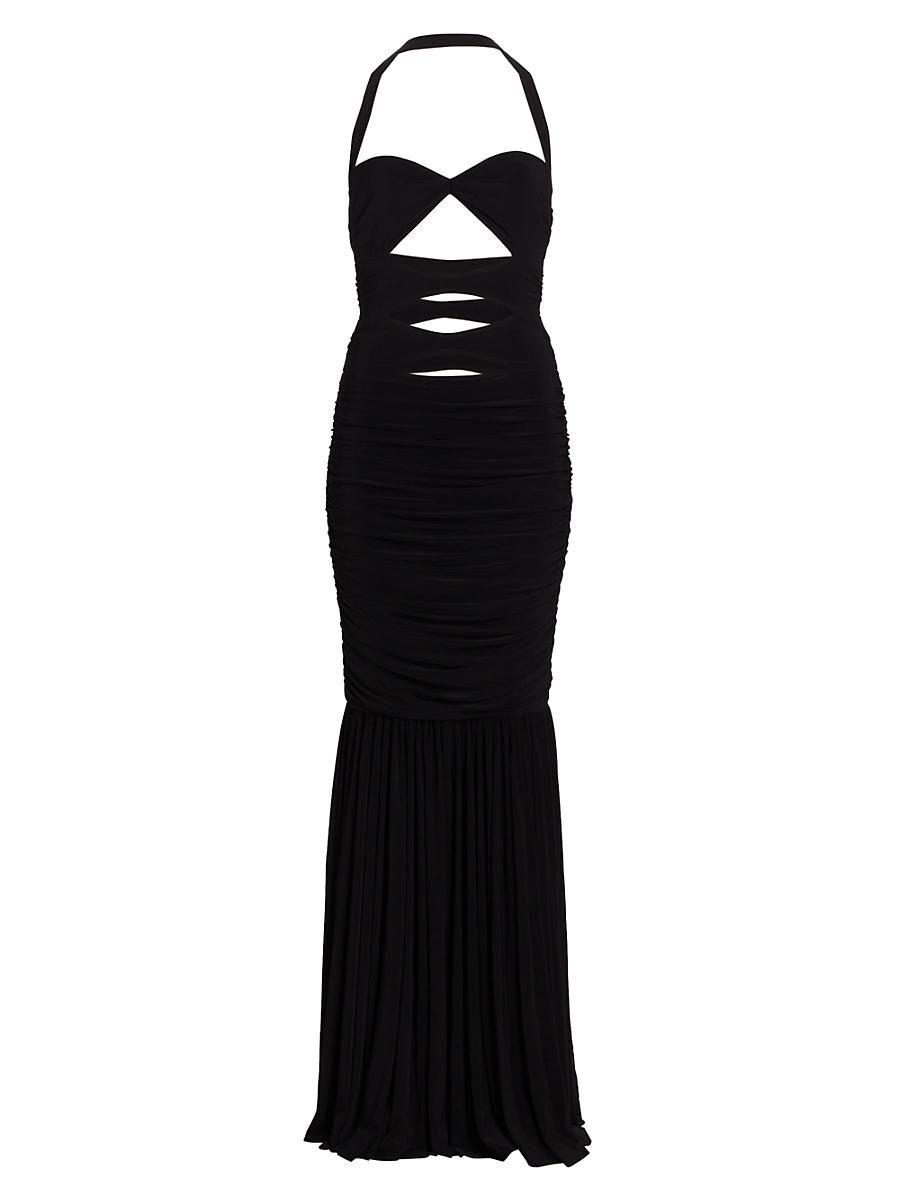The Mio fishtail gown from Norma Kamali flaunts diamond-shaped cut-out detail in a body-hugging silhouette. Halterneck Sweetheart neckline Sleeveless Shirred sides Fishtail hem 95% polyester/5% spandex Machine wash Imported SIZE & FIT About 64.5 from shoulder to hem Bust, about 26 Waist, about 24 Hips, about 28 Model measurements: 510 tall Model is wearing US size Small Please Note: Compared to the Brands Size Guide, this style measures true to size. Dress Collections - Contemporary Evening > Norma Kamali > Saks Fifth Avenue > Barneys. Norma Kamali. Color: Black. Size: XXS.