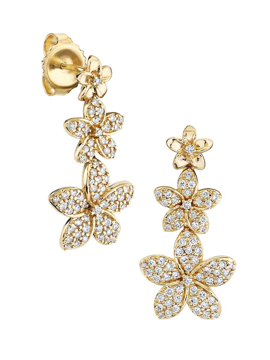 Comprised of three linked flowers, Sydney Evans Plumeria earrings feature a linear drop silhouette embellished with glittering diamond pav. Diamonds, 0.55 tcw Diamond color: H-I Diamond clarity: SI2 14K yellow gold Ear post Made in USA SIZE Drop, about 1. Fashion Jewelry - Fashion Designer > Sydney Evan > Saks Fifth Avenue > Barneys. Sydney Evan. Color: Gold.