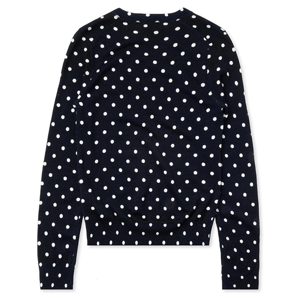 The concept of the Comme des Garcons PLAY line is design by not designing. Characterized by the iconic red heart logo designed by artist Filip Pagowski, the line is a collection of unisex basics, fragrances, and footwear for those who enjoy simplicity. Pictured is the Comme des Garcons PLAY Womens Polka Dot Sweater in Navy. AZ N035 051 2 COMME DES GARCONS PLAY APPAREL HAS A SMALLER FIT, WE RECOMMEND SIZING UP. 100% Wool Ribbed edges Made in Japan Style no: AZ-N035-051-2