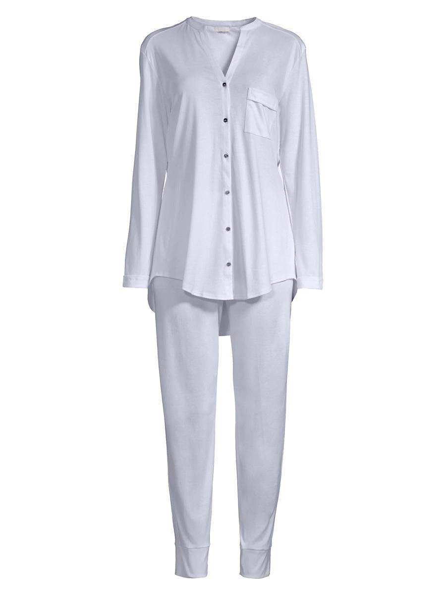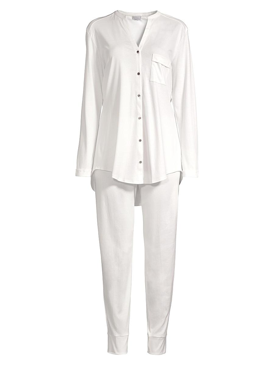 From the Pure Essence collection. Classic pajamas made from ultra-soft cotton Split neck Long sleeves Chest patch pocket Button front Shirttail hem About 26 from shoulder to hem Elasticized waist Tapered cuffs Pull-on style Inseam, about 30 Cotton Machine wash Imported. Lingerie - Hanro > Hanro > Saks Fifth Avenue > Barneys. Hanro. Color: Blue Glow. Size: Medium.