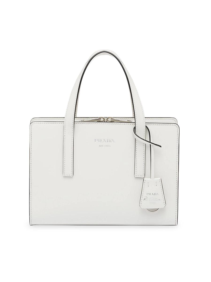 This handbag, a re-edition of an iconic Prada bag of 1995, is characterized by its elegant geometric silhouette with distinct, minimalist lines. Formal allure and practicality meet in its design with a central zipper closure, enhanced by the sophisticated accent of the screen-printed lettering logo. The accessory is made of fine brushed leather, an expression of the brands expertise. Leather handles Detachable, adjustable leather shoulder strap, length: 105 cm Re-Edition removable leather keychain Metal hardware Hot-stamped front logo Nylon logoed inner with zipped partition Imported This product is not eligible for extended holiday returns SIZE 22.0W x 15.0H x 6.5L. Lsd Handbags - Prada Handbags Access > Prada > Saks Fifth Avenue > Barneys. Prada. Color: White.
