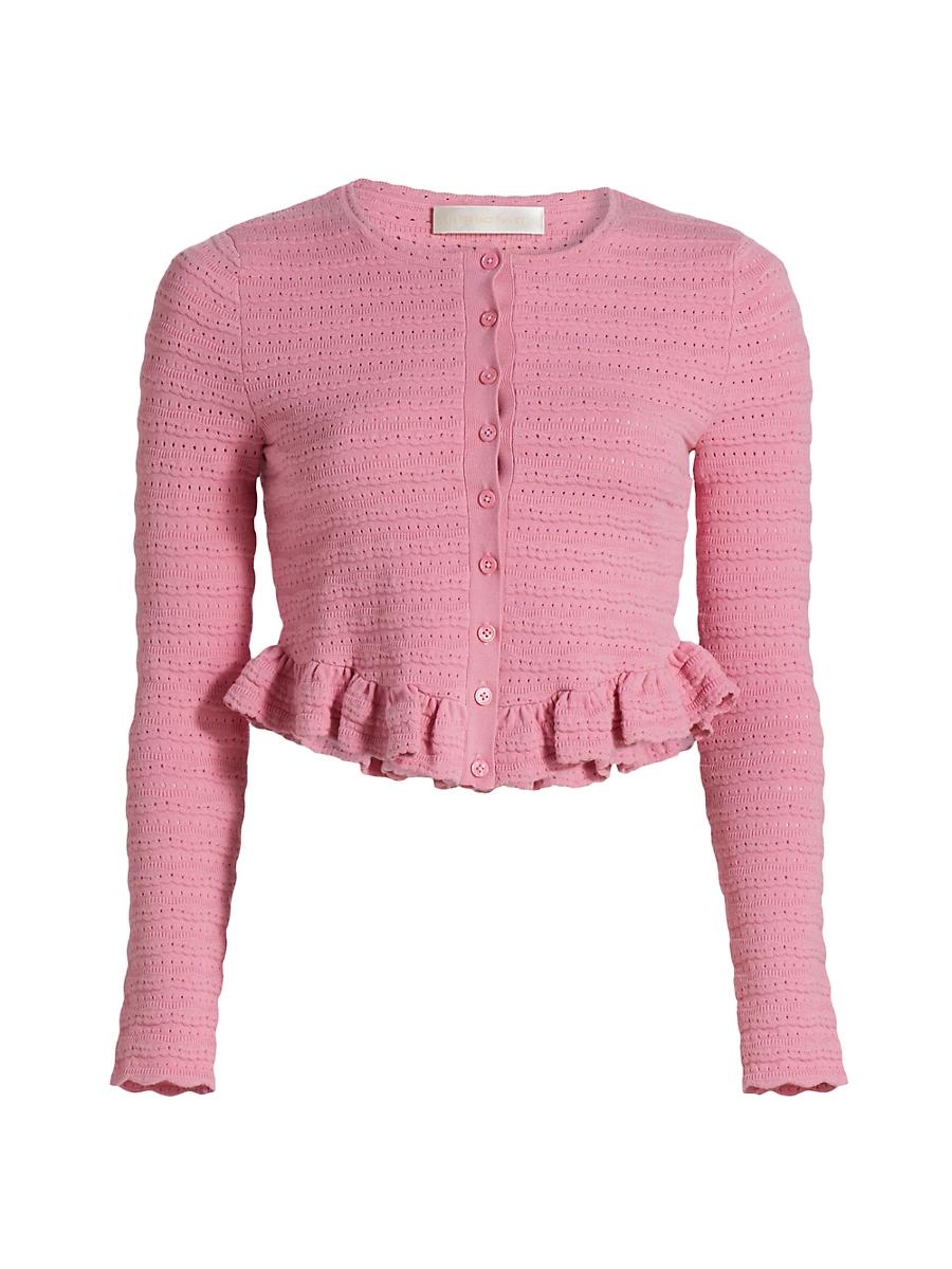 This fitted button-front Rogan pointelle-knit cardigan from LoveShackFancy is styled with a round neck, scallop trim, and a ruffled hem. Round neck Long sleeves Scallop trim Ruffled hem Button-front closure 82% viscose/18% polyester Machine wash Imported SIZE & FIT About 18.5 from shoulder to hem Model measurements: 510 tall Model is wearing a US size Small. Contemporary Sportswear - Trend > Loveshackfancy > Saks Fifth Avenue > Barneys. LoveShackFancy. Color: Morning Sky. Size: XS.