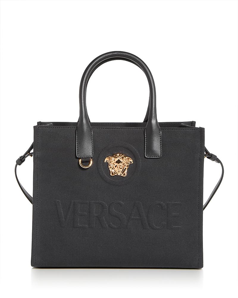 Versaces small tote bag is crafted of logo-embossed canvas. Leather straps and a goldtone Medusa plaque complete this style. Snap closure Dual top handles Removable, adjustable shoulder strap Interior zip pocket Cotton/acrylic Trim: Leather Made in Italy SIZE About 9.5W x 11.5H x 5.75D. Handbags - Italian Designers > Versace > Saks Fifth Avenue > Barneys. Versace. Color: Bianco.
