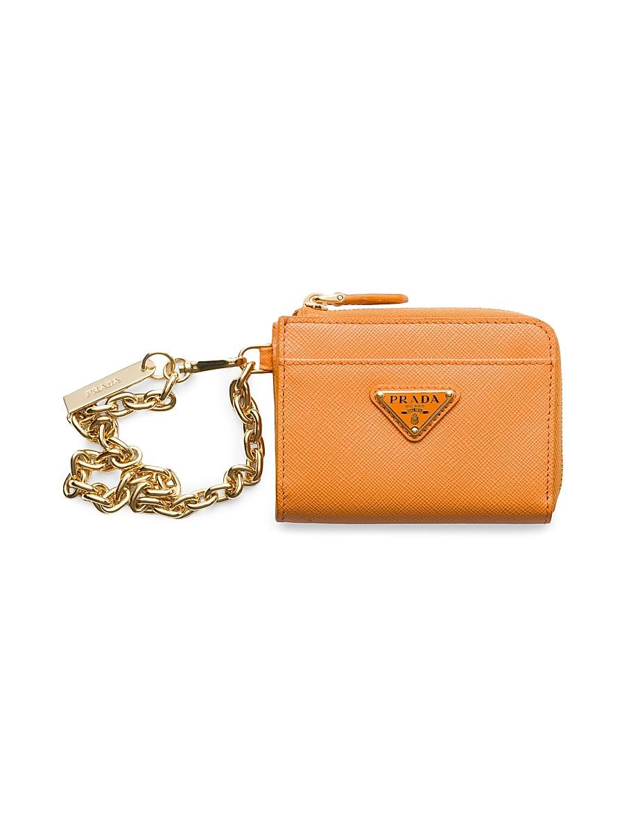 Enameled metal triangle logo One bill compartment Four card slots One external pocket Moir and Saffiano leather lining Chain wristlet with snap-hook Imported 100% Calf Leather 11W x 9H cm / 4.3W x 3.5H in. Lsd Handbags - Prada Handbags Access > Prada > Saks Fifth Avenue > Barneys. Prada. Color: Pink.