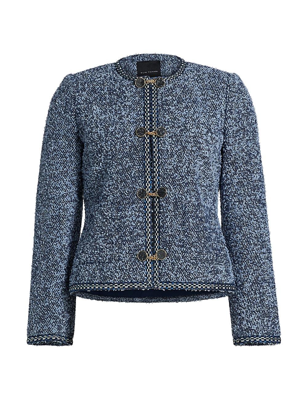 Elie Taharis Dionne jacket is crafted of boucle tweed with contrasting trim. Hardware chain-and-button toggles lend ornate detail to this style. Jewelneck Long sleeves Side patch pockets Front chain-and-button toggle closure 74% cotton/ 26% nylon Lining: 100% polyester Dry clean Imported SIZE & FIT About 22.5 from shoulder to hem Model measurements: 510 tall Model is wearing a US size Small. Modern Collections - Elie Tahari > Elie Tahari > Saks Fifth Avenue > Barneys. Elie Tahari. Color: Cremona Blue Tweed. Size: XL.