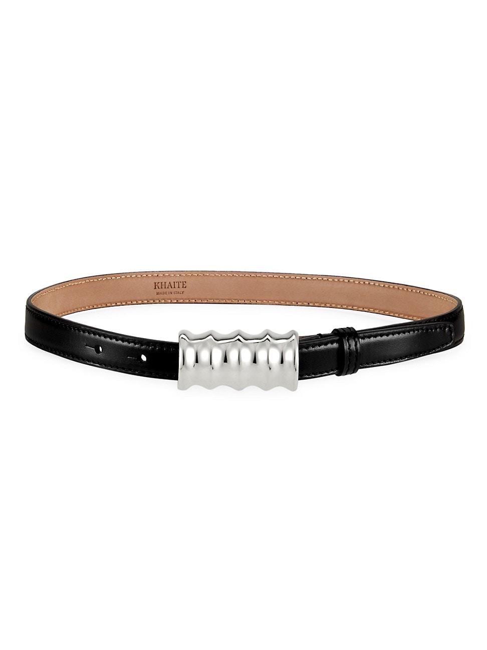 Made in Italy, the small Julius belt from Khaite is accented by a sculptural buckle, inspired by the Machine Age. Adjustable buckle Silver-plated brass Leather Made in Italy SIZE About 0.75W. Soft Accessories - Belts > Khaite > Saks Fifth Avenue > Barneys. Khaite. Color: Black. Size: XS.
