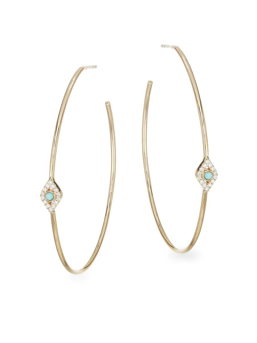 Turquoise bezel eye punctuates delicate gold hoop 14k yellow gold Turquoise Diamond, 0.084 tcw Diameter, 1.625 Post back closure Wipe clean Imported. Fashion Jewelry - Fashion Designer > Sydney Evan > Saks Fifth Avenue > Barneys. Sydney Evan. Color: Yellow Gold.