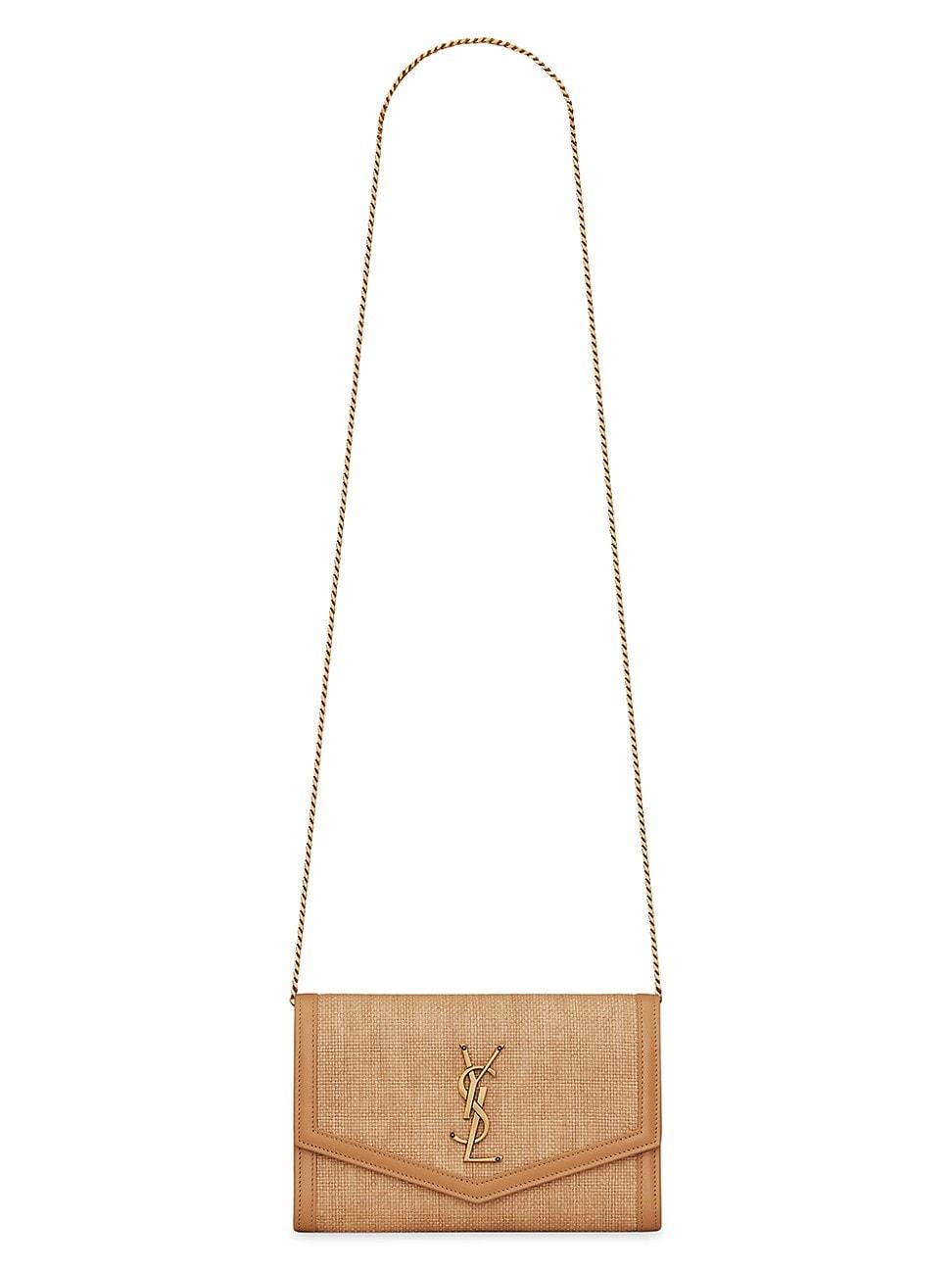 Mini envelope bag decorated with the Cassandre, featuring a removable chain strap for shoulder or hand carry as a clutch. a fragments card case with three card slots is included. Dimensions: 19 x 12 x 3 cm / 7.4 x 4.7 x 1.1 inches Bronze-tone metal hardware Snap-button closure Interior: one main compartment One flat pocket One removable fragments card case with 3 card slots Strap drop: 48 cm. Lsd Handbags - Saint Laurent > Saint Laurent > Saks Fifth Avenue > Barneys. Saint Laurent. Color: Natural Hay Blush.