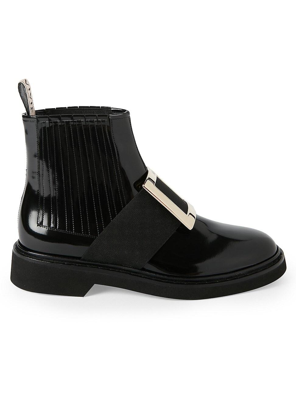 Mod ankle boots with a shiny patent leather construction and goldtone buckle detail. Leather upper Round toe Pull-on style Rubber sole Made in Italy SIZE Block heel, 1 (25mm). Womens Shoes - Roger Vivier Womens Shoe > Roger Vivier > Saks Fifth Avenue > Barneys. Roger Vivier. Color: Black. Size: 8.5.
