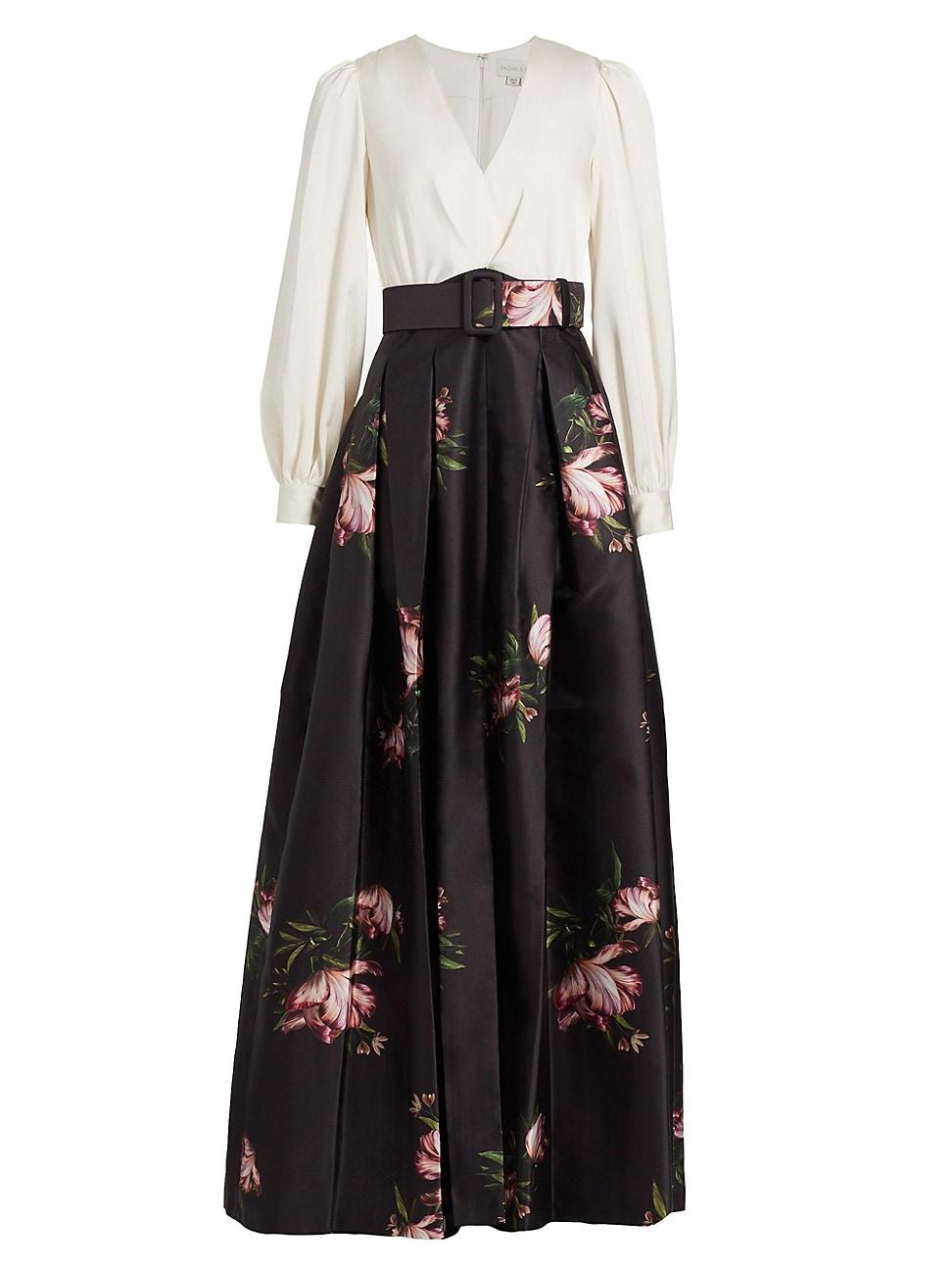 Sachin & Babis Zoe A-line gown showcases a dynamic two-tone design, featuring a crisp solid bodice and darkened floral skirt. Tailored with a V-neck, this piece features a self-belt waist and side on-seam pockets. V-neck Long sleeves, snap cuffs Self-belt Side on-seam pockets Concealed back zip closure 100% polyester Dry clean Imported SIZE & FIT This style is constructed in a woven, no-stretch fabric for a fitted shape Measurements are taken from a US size 2 About 60 from shoulder to hem Bust, about 34 Model measurements: 510 tall Model is wearing a US size 4. Dress Collections - Contemporary Evening > Sachin & Babi > Saks Fifth Avenue > Barneys. Sachin & Babi. Color: Ivory Noir Blossom. Size: 10.