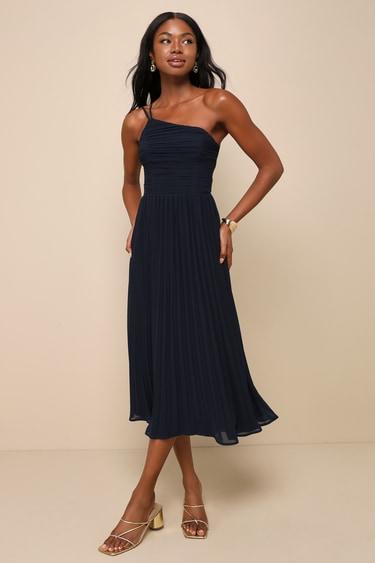 Swoon-worthy style is easy to achieve this season when you have the Lulus Wondrous Muse Navy Blue Pleated One-Shoulder Midi Dress in your wardrobe! Lightweight, pleated chiffon shapes this gorgeous dress that features a princess-seamed bodice, a trendy one-shoulder neckline, and dual adjustable spaghetti straps. The high, fitted waist tops a breezy A-line skirt that falls to an elegant midi hem. Hidden back zipper/clasp.