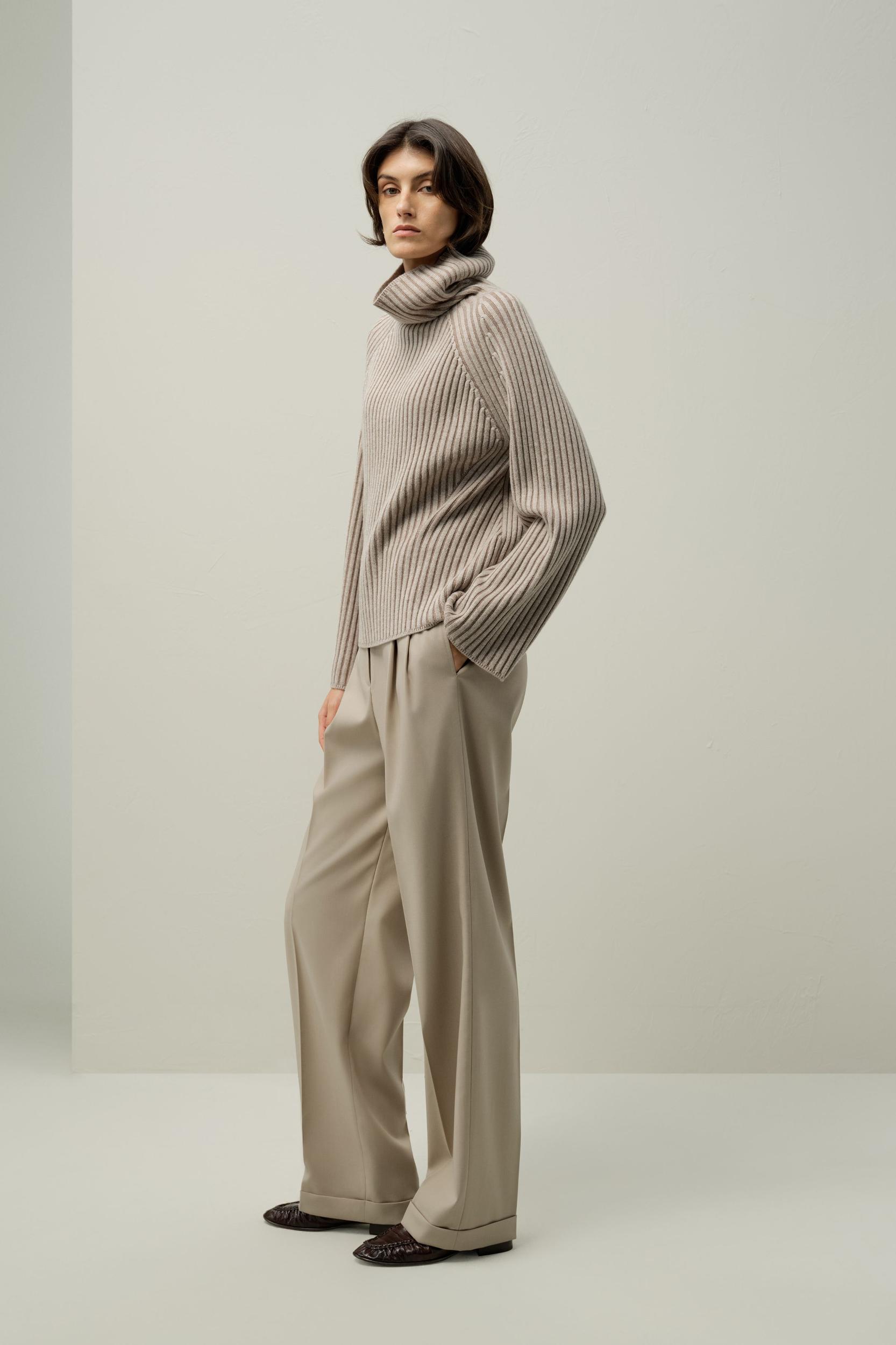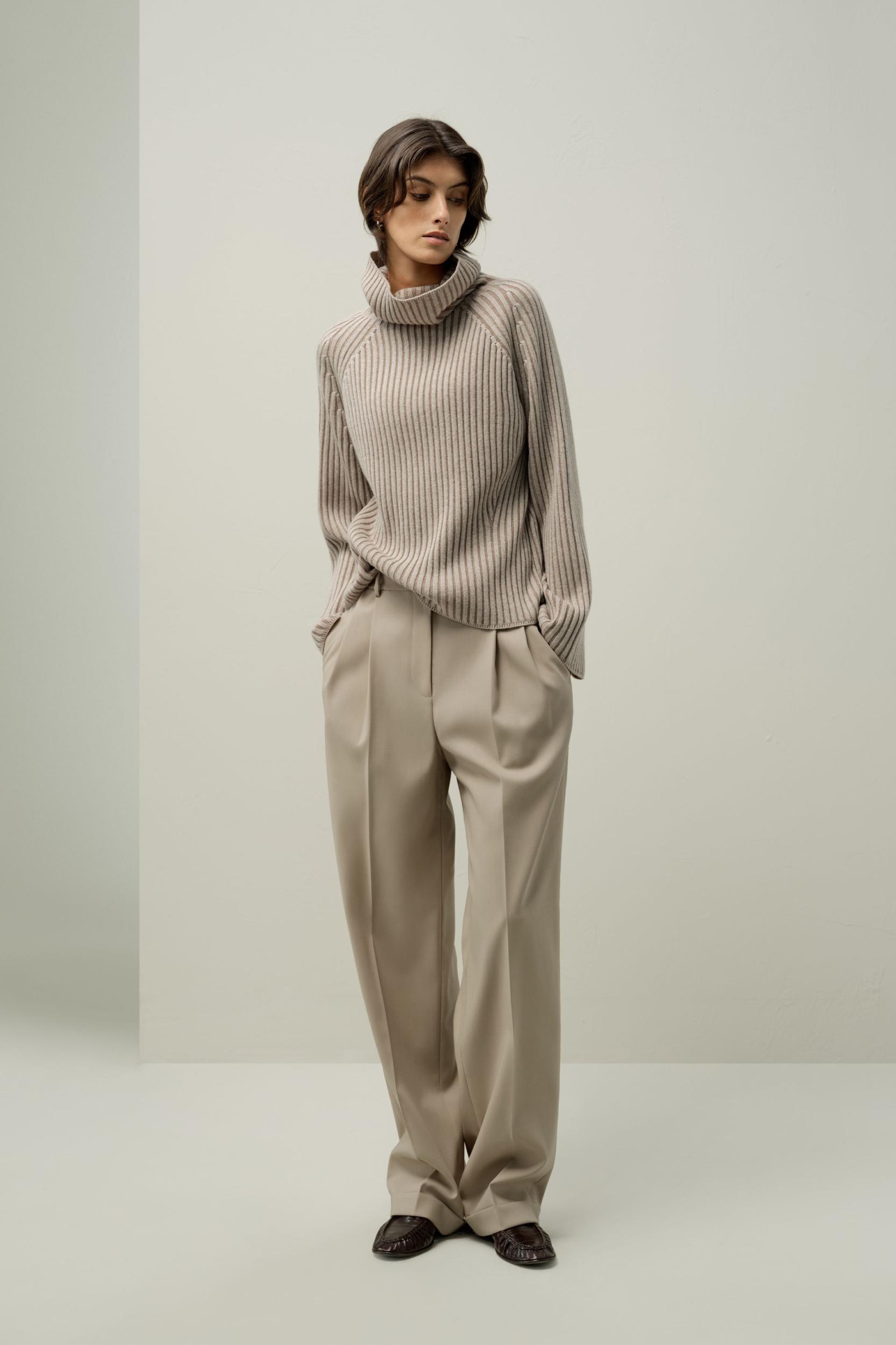 Crafted with a premium 70% merino wool and 30% cashmere blend, this high-neck sweater offers breathable warmth, luxurious softness, and versatile style. Featuring raglan sleeves, double-toned rib detailing, it’s perfect for layering or standalone wear.