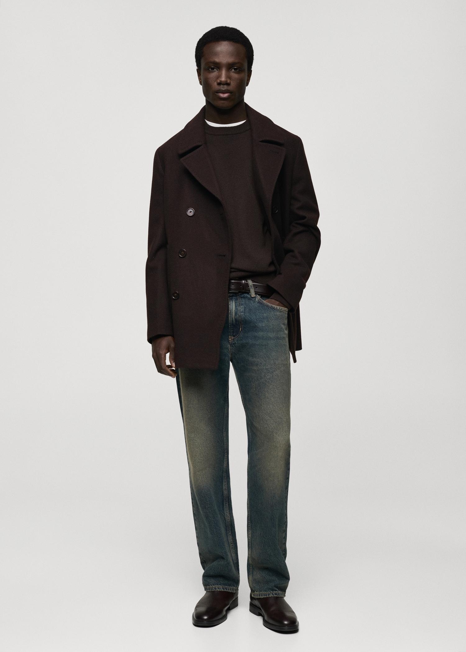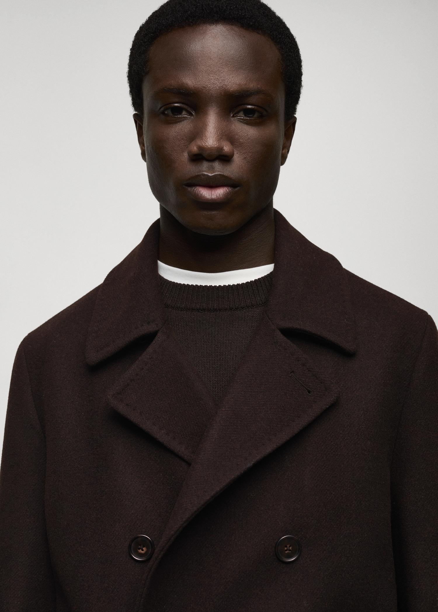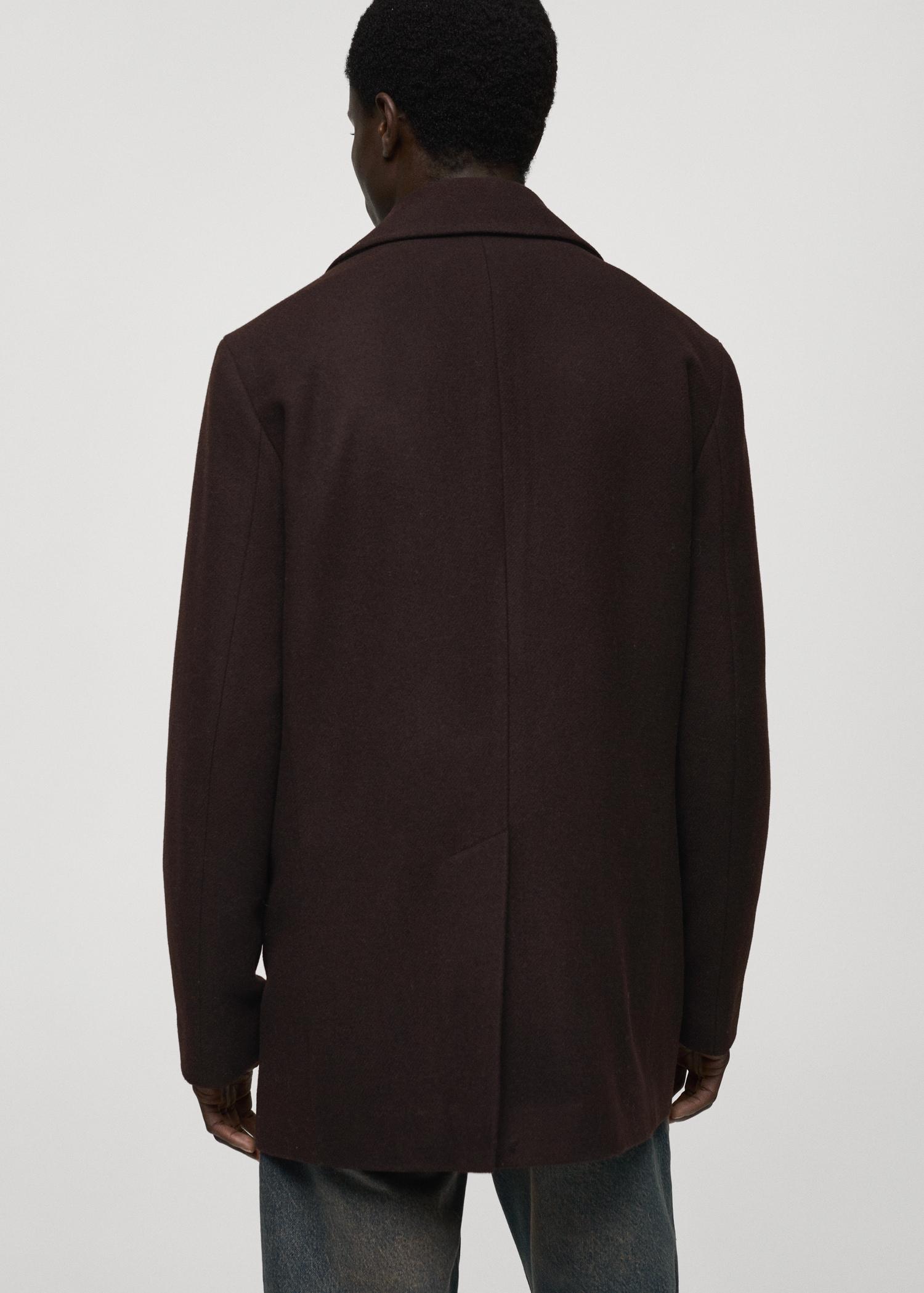Wool mix fabric. Regular fit. Short design. Wide lapel collar. Eight-button double-breasted closure. Inner counterbutton for better grip of the outer button. Back-slit hem. Inner lining. Inner pocket. The model is 6'3" and is wearing a size M. Two welt pockets on the front. Side length 24.02 in. Back length 33.27 in