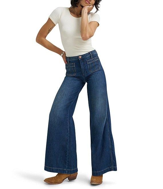 From Wrangler, these jeans feature: Denim fabrication High-rise waistline Zip-fly with button closure Trouser silhouette Front patch hip pockets Contrast embroidery detail Antiqued copper hardware Full length Approx. 10.75" front rise, 28" leg opening Cotton Machine wash Imported.