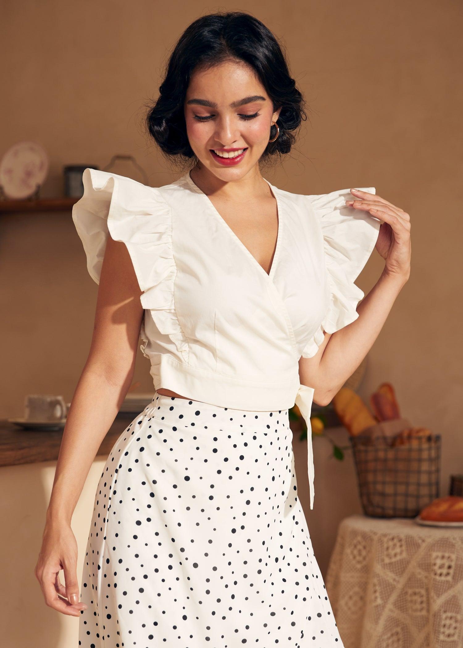 Sweetly styled and ready to flatter, the Wrapped in Ruffles Top from our ModCloth namesake label brings a touch of romance to your everyday wardrobe. Featuring fluttery ruffle sleeves, a wrap silhouette that ties at the waist, and a just-right V-neckline, it’s the perfect blend of comfort and charm—ideal for dressing up denim or pairing with your favorite flowy skirt.Machine wash cold100% CottonLength: 16.5"ImportedModel is wearing a US size SModel Measurements: Height 5'10" / Bust 29.5" / Waist 22.8" / Hips 34.6"