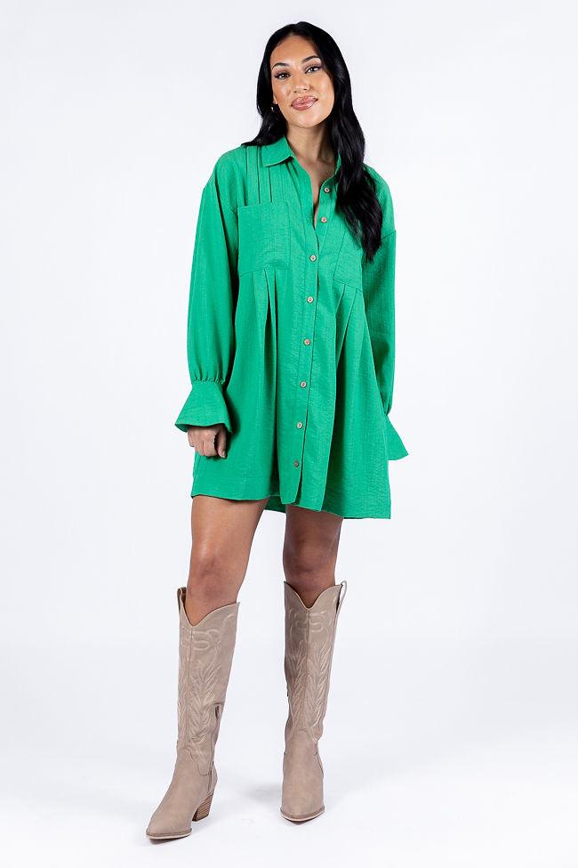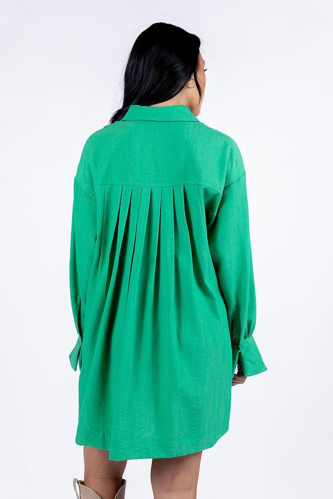 Details Green Button Up Shirt Dress Fabric has some stretch Functional button up closure, collared style, functional pocket, long sleeves Unlined Size small from shoulder to hem: 29" Material and Care 49% rayon 34% polyester 17% spandex Hand wash cold, no drum drying Patterns may vary Materials may have natural variations Colors may vary from different viewing devices