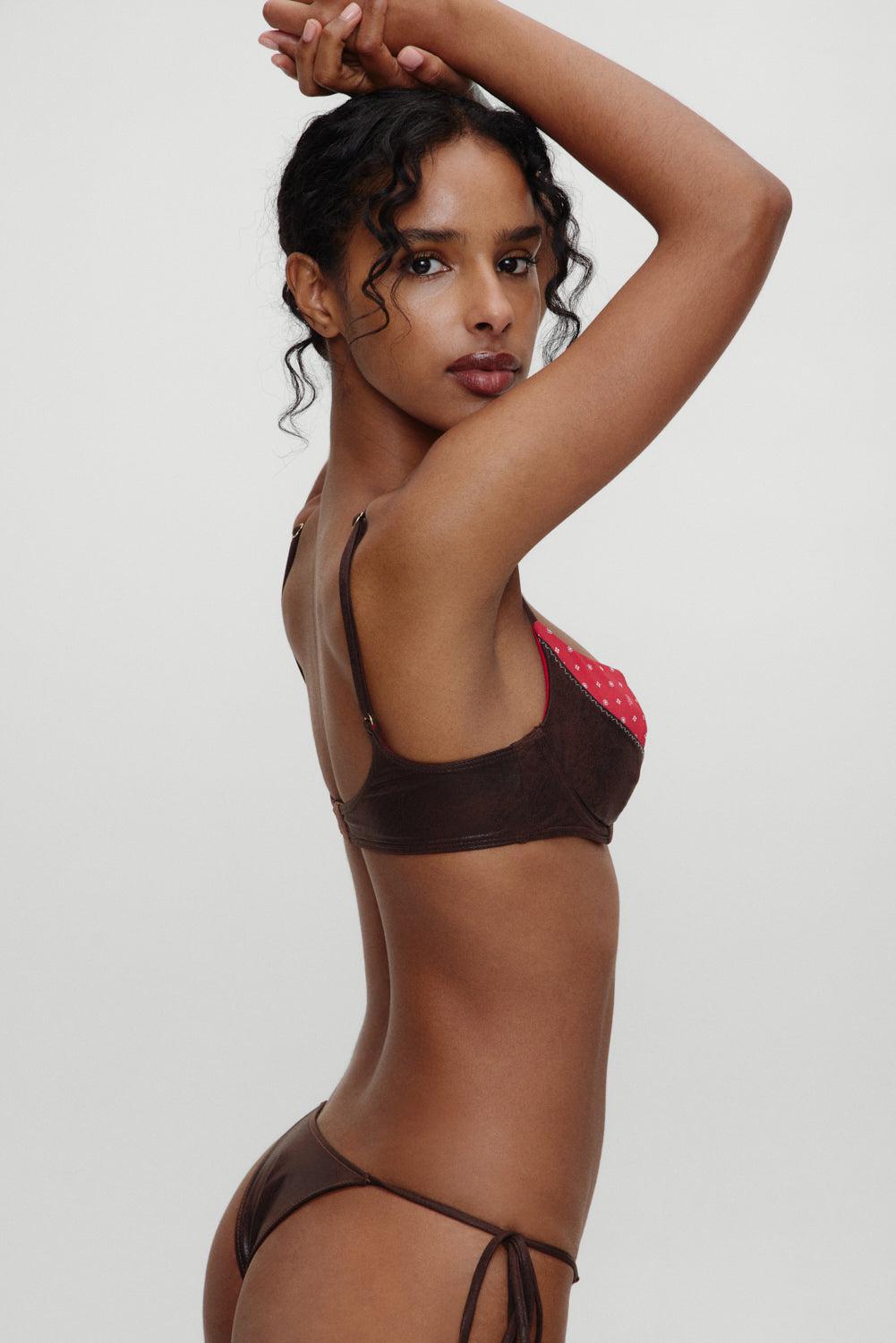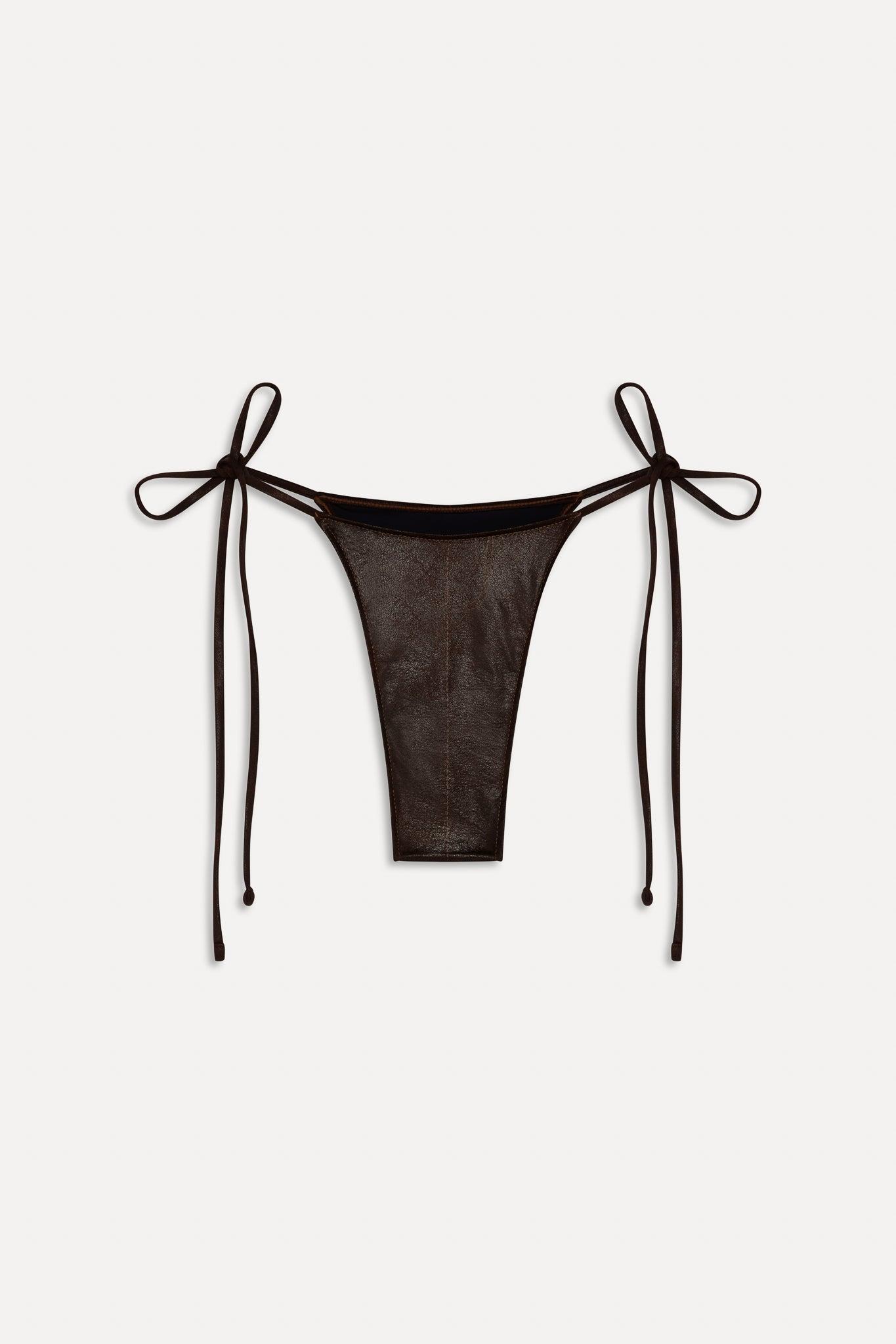 Designed with a low rise cut and skimpy coverage, the Divine bikini bottom is a must-have travel silhouette. Exclusively from the Bella Hadid x Frankies Bikinis collaboration. Details Custom leather-look swim fabric Adjustable string side ties for a personalized fit Western stitch detailing Fabric 87% Polyamide + 13% Spandex Model Size & Fit This style runs true to size Eileen is wearing a size Small Height 5’9” (175cm) Bust 32” (81.5cm), Waist 25.5" (65cm), Hips 35" (89cm)