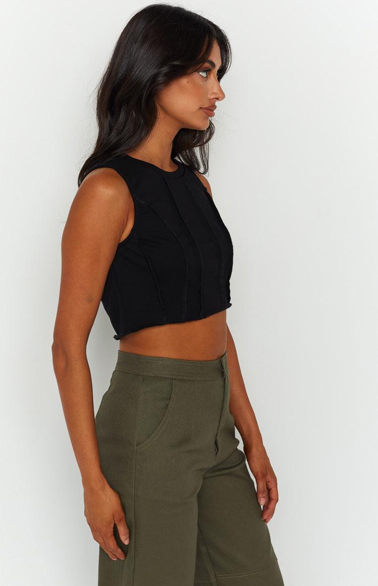 Black Cropped Tank Top This black cropped tank is perfect for days around the house lounging or running errands! Pair with some cool pants and sneakers and you'll be looking stylish yet comfy. Cropped tank Unlined Hem detailing on the front Has minimal stretch High neckline