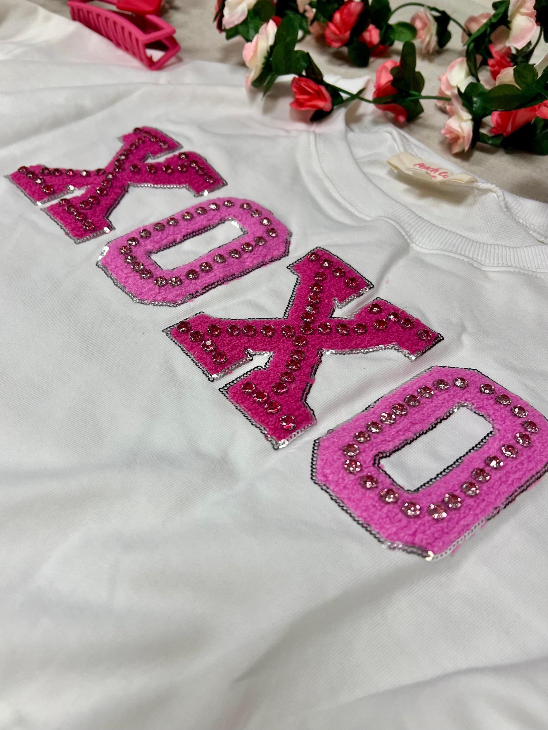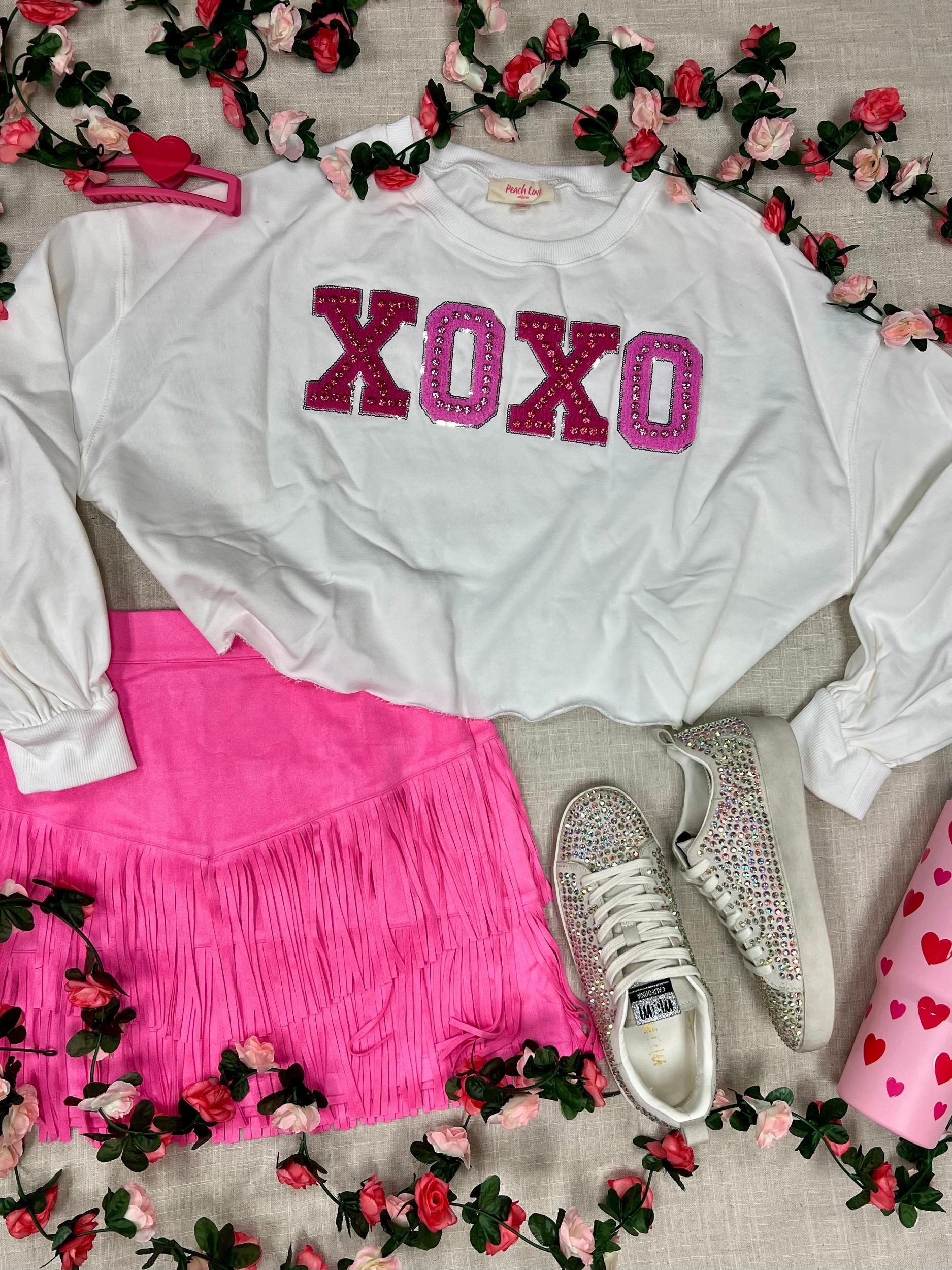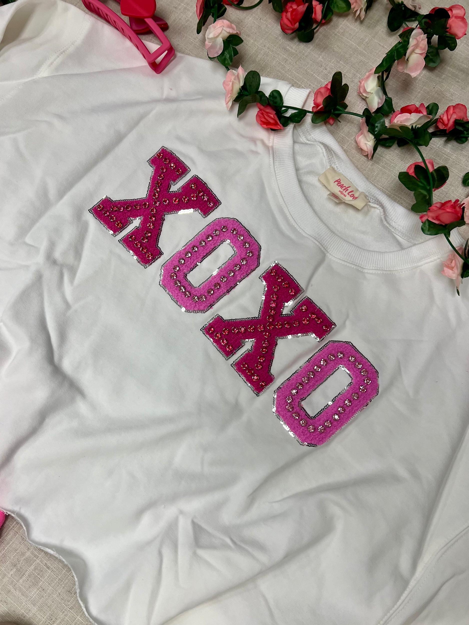 "Spread the love with the XOXO Cropped Sweater. This playful and stylish sweater features a white and pink color scheme, perfect for Valentine's Day. The long sleeves and cropped design add a trendy touch, while the jewel embellishments add a touch of sparkle. Wear it to show off your fun and flirty side!" 60% Cotton 40% Polyester
