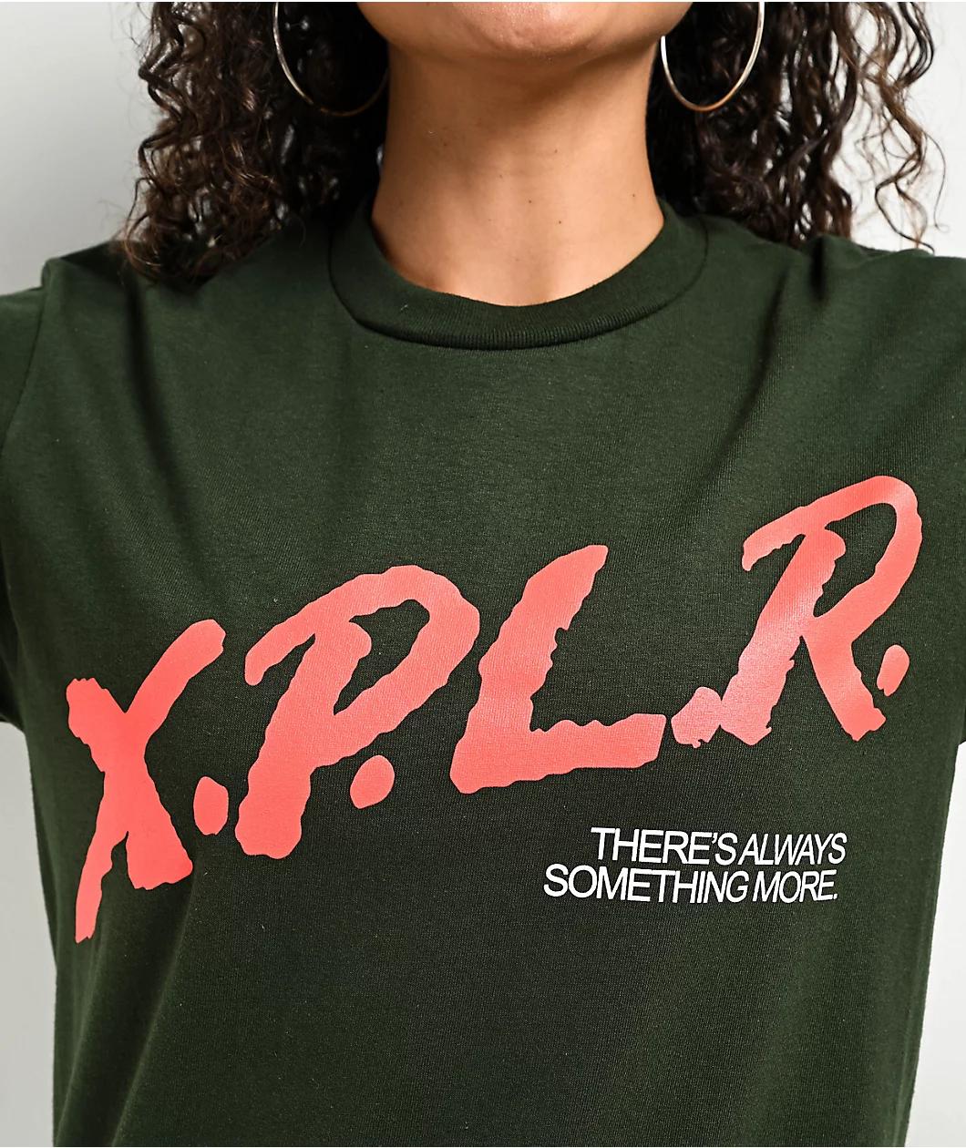 From XPLR, comes the Dare t-shirt in a dark green colorway showing a large screen-printed graphic on the front. The graphic tee boasts "X.P.L.R." in nostalgic red lettering with "There's always something more." written below. This shirt is made from