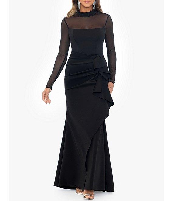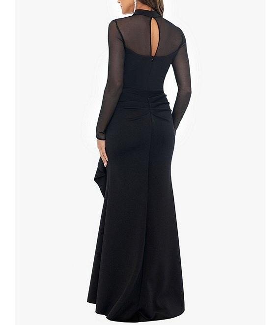 From Xscape, this gown features: Scuba crepe fabrication Column gown silhouette Mock neckline Long mesh illusion sleeves Mesh illusion yoke Princess seams at bodice Waist seam Ruffle front detail Ruched detail at back Zip back closure Approx. length 61" from high point shoulder Nylon/spandex Dry clean Made in the USA.