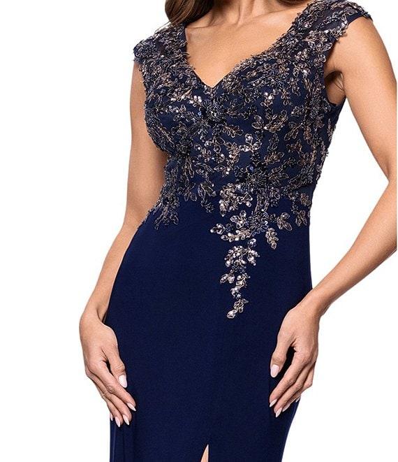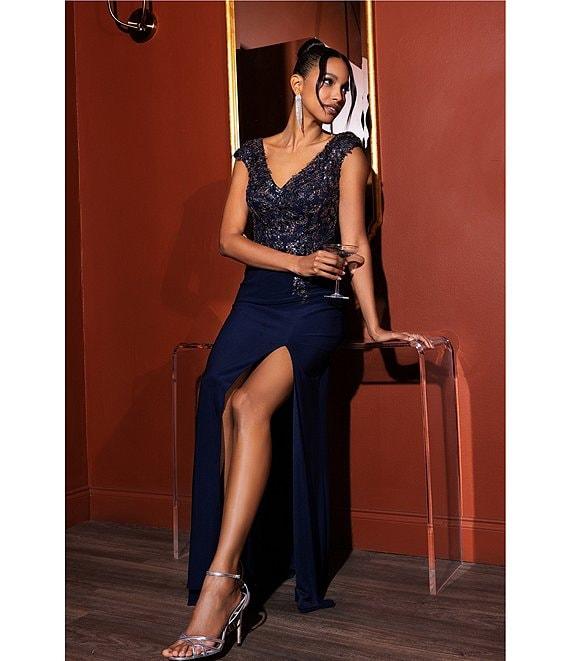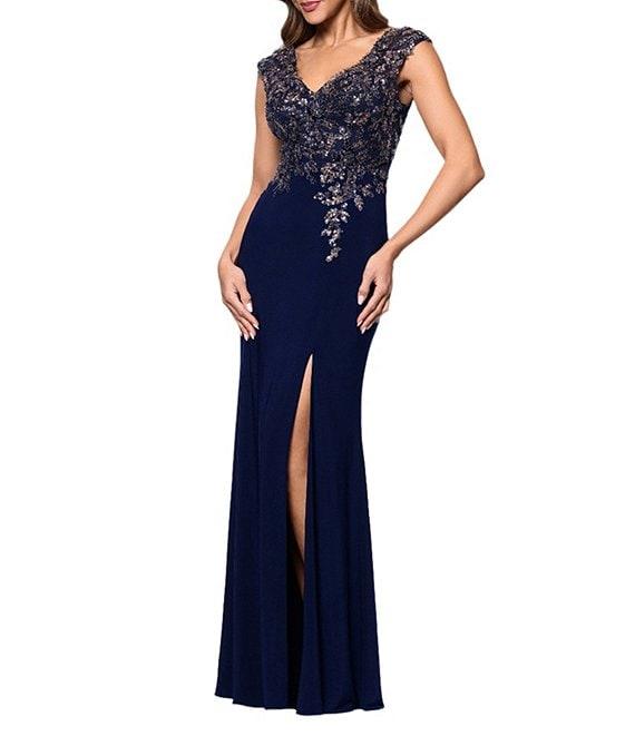 Xscape V-Neck Bead Bodice Front Slit Knit Jersey Sheath Gown