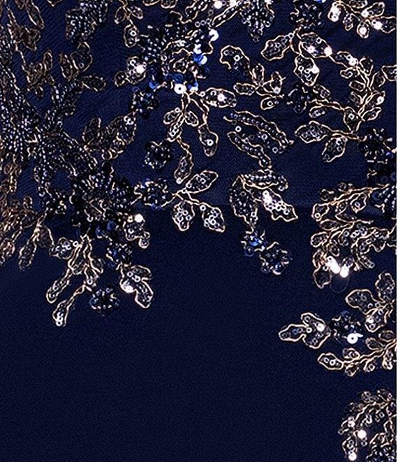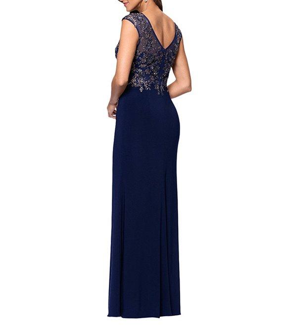 From Xscape, this gown features: Sheath silhouette Knit jersey fabrication Beaded bodice V-neckline Sleeveless Front slit Zip back closure Lined Approx. 61" length Polyester Spot clean Imported.