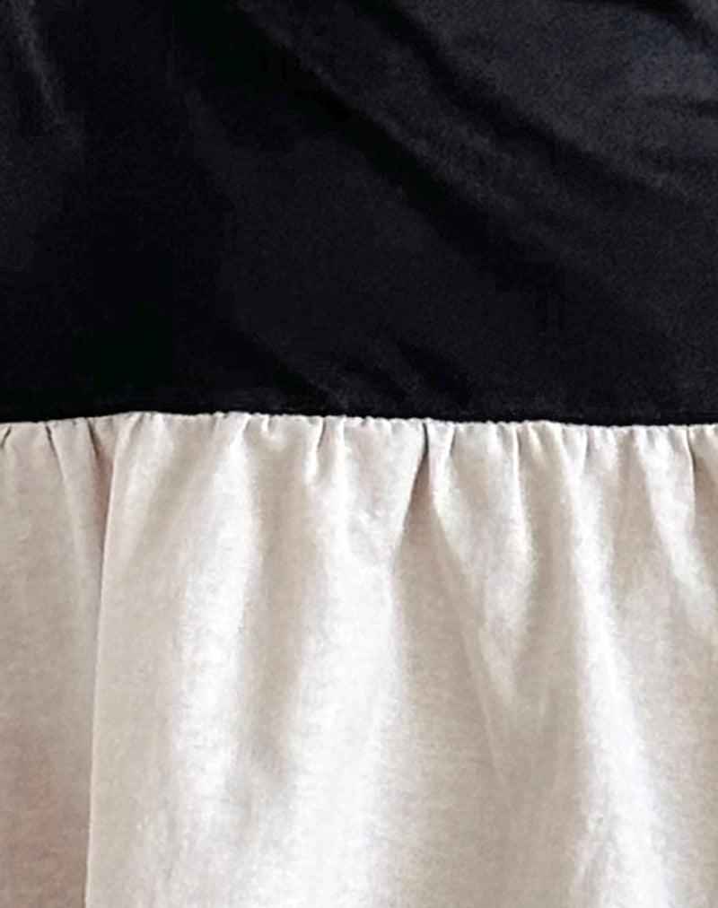 The Yael dress features an a-line mini design with an ecru linen voluminous skirt and a contrasting black lycra body with a bardot neckline MODEL WEARS SIZE: SMALL - MODEL HEIGHT:5'6