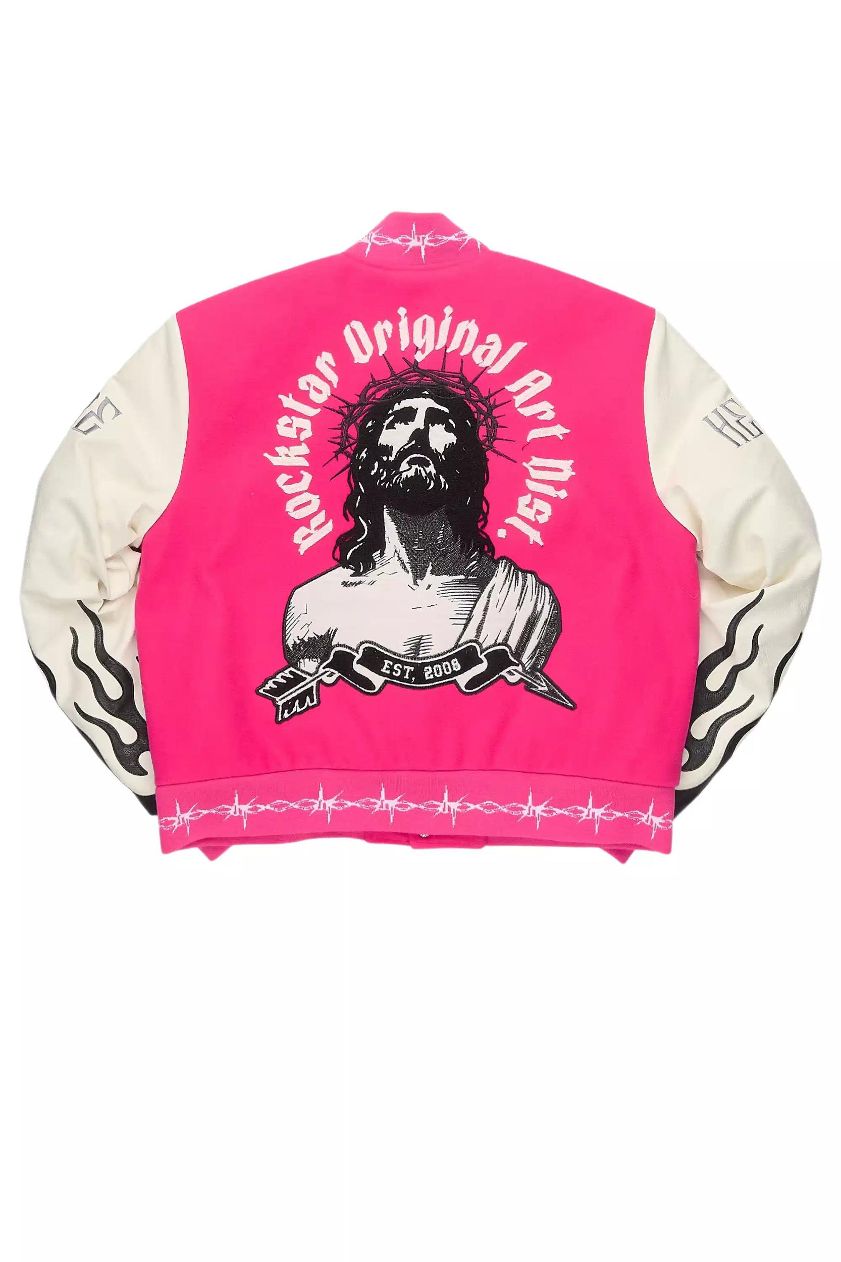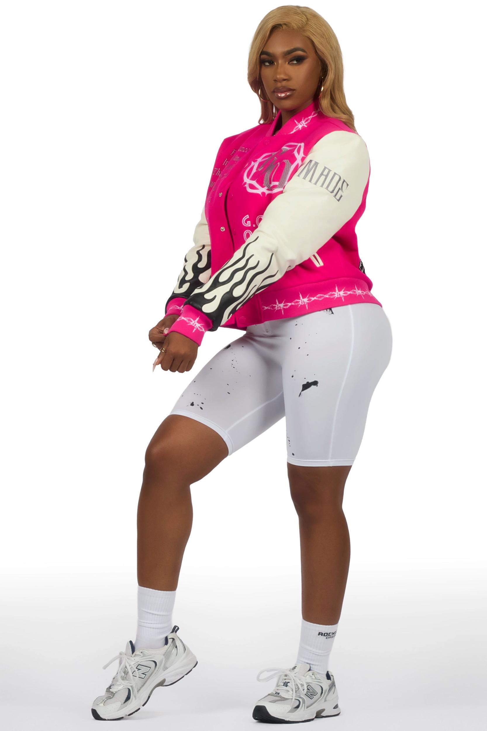 An urban collegiate varsity jacket for women in hot pink. Designed with an ultra soft fleece body and contrast faux leather sleeves for a dope outerwear style. Ribbed knit baseball collar Faux leather sleeves Quilted designing Snap button closure Ribbed knit trims Dual slant pockets Hidden phone pocket Custom embroidery Graphic chenille patches Oversized fit